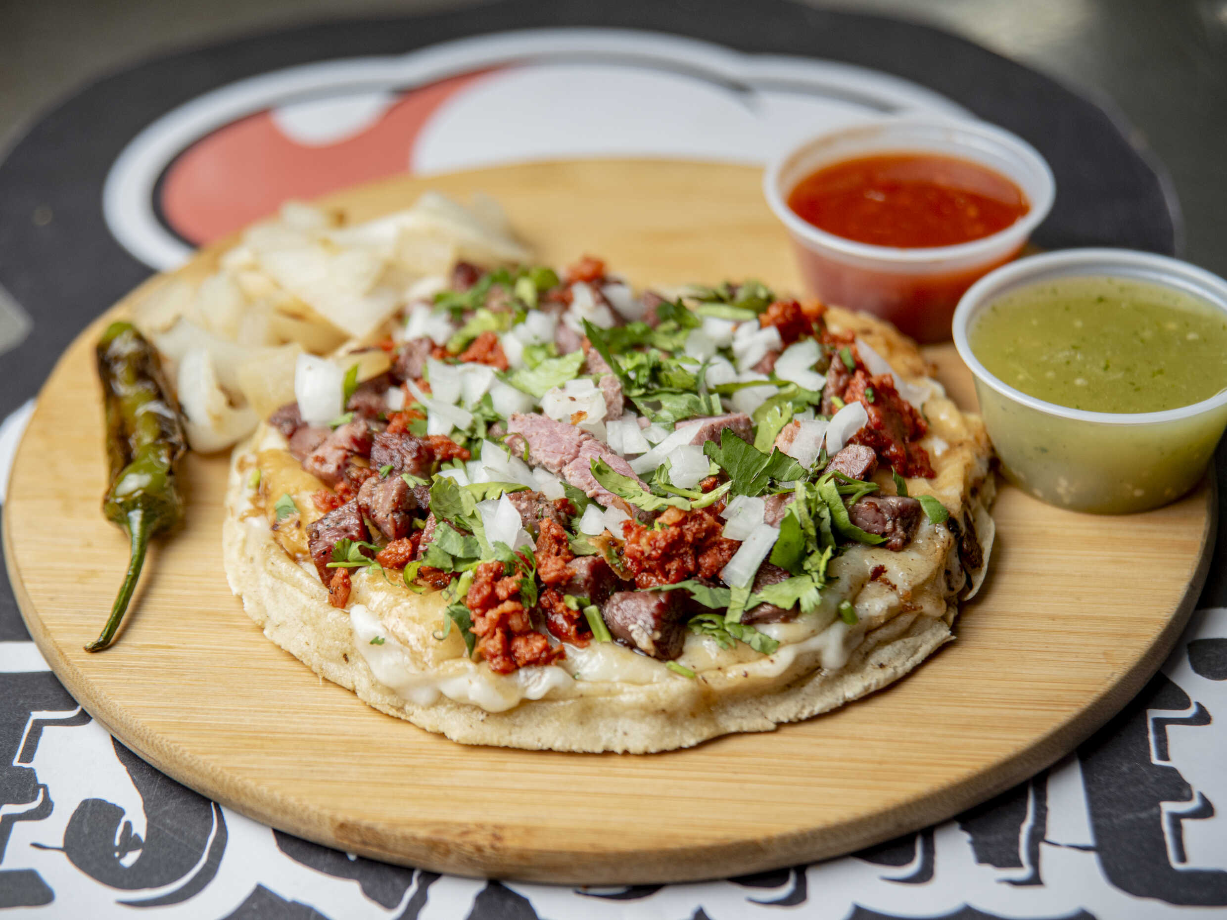 Pellizcada de 18 Cm, Acompañada de queso gratinado y Arrachera, cebolla y Cilantro.
