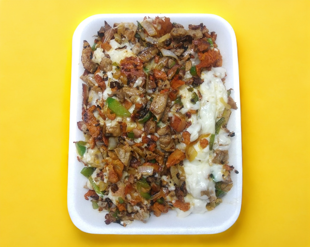 Con: bistec, pastor, morrón y queso.