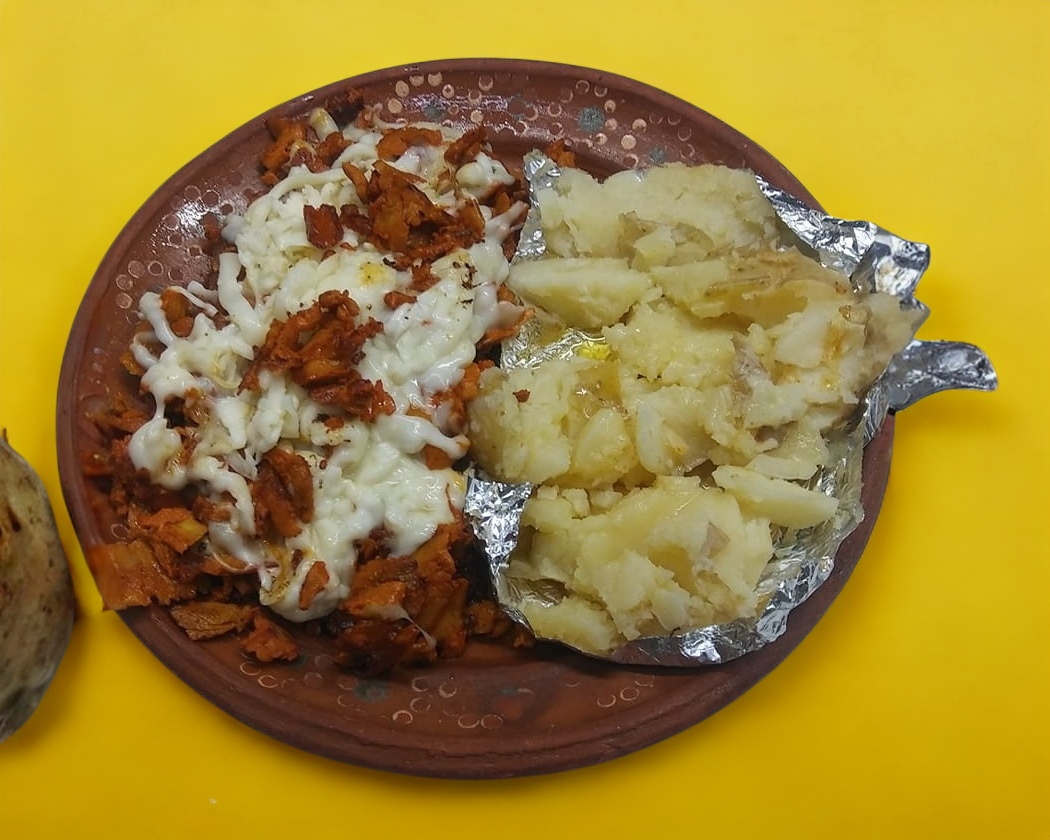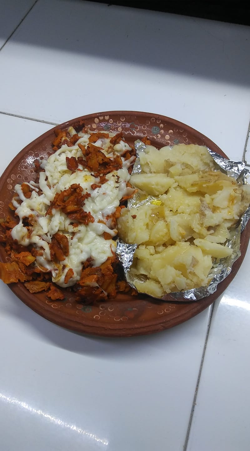 Papa asada con pastor y queso