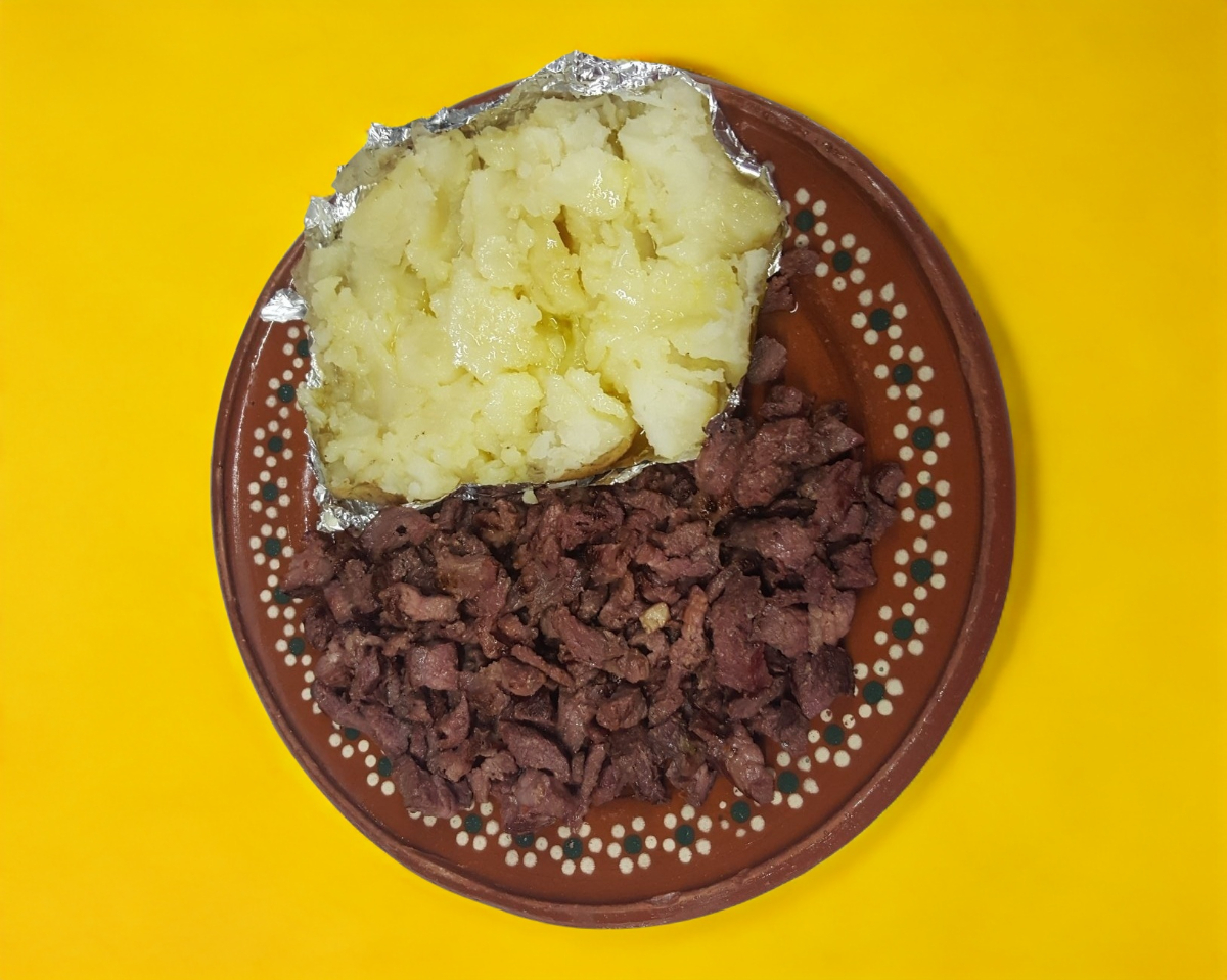 Papa asada con arrachera y queso