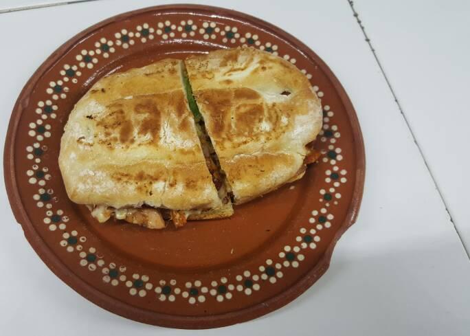 Lonche de pastor con queso con aguacate y jitomate.