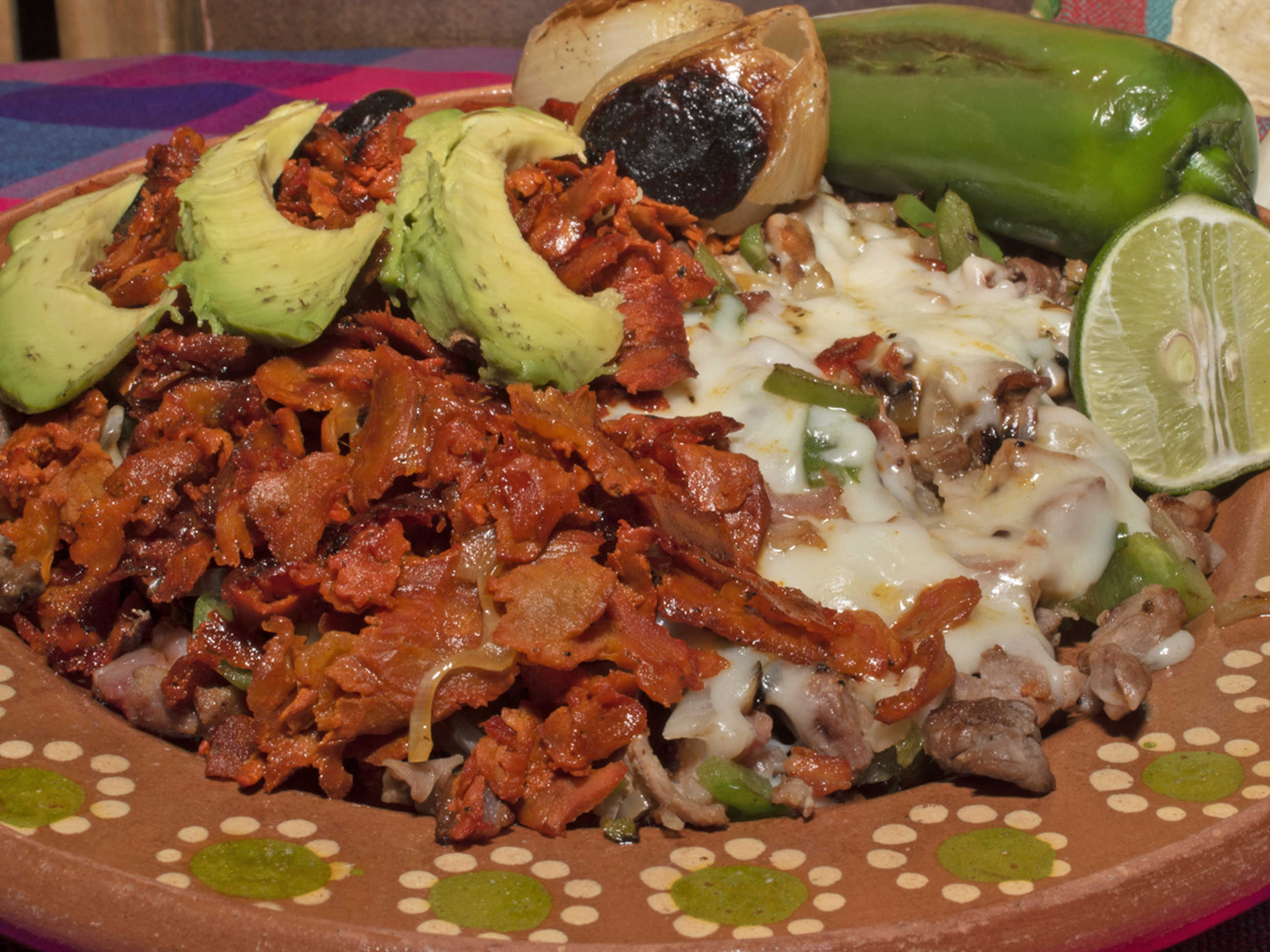 Con: bistec, chuleta, tocino, cebolla, morrón, queso, pastor y aguacate.