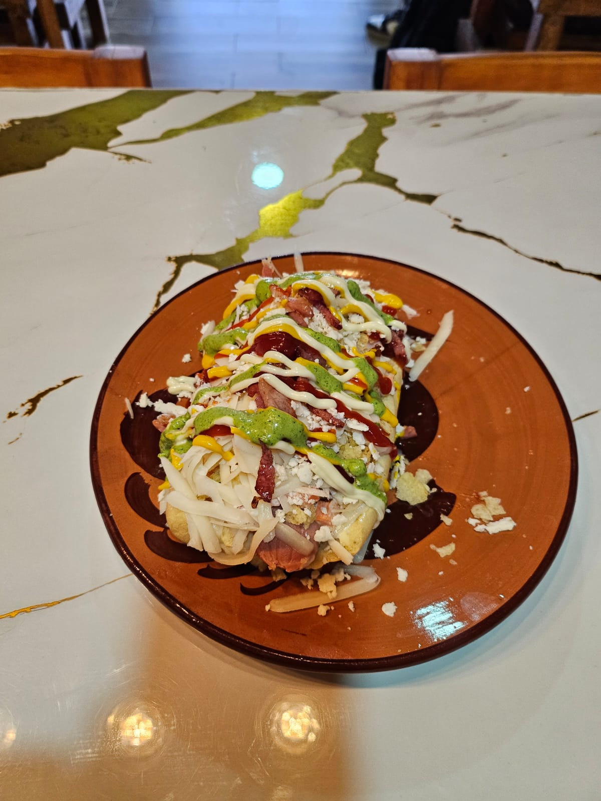 Salchicha con vegetales, tocineta, tomate, cebolla, cilantro, papa triturada y queso.