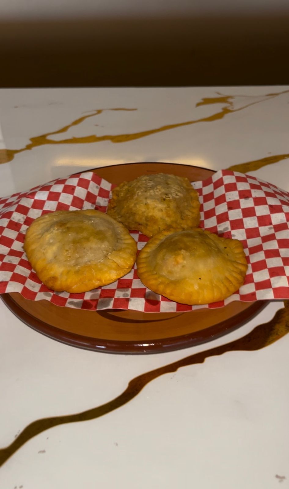 Empanada tradicional rellena de cazón guisado con ajíes y especias, sabrosa y jugosa.