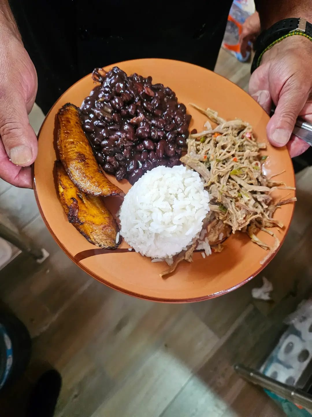 Con frijoles negros carne deshebrada plátano macho frito y queso llanero