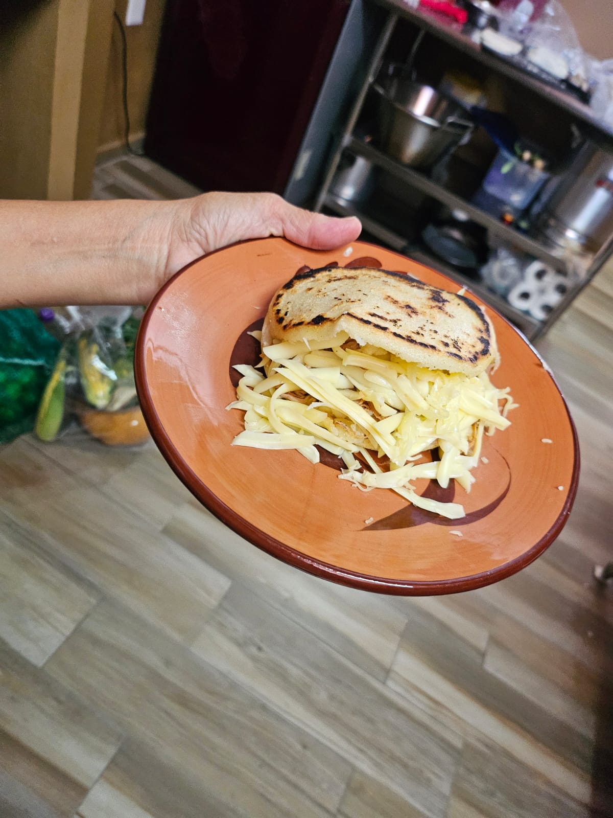 Nuestra reina pepeada con pollo deshebrado con aguacate y mayonesa y queso amarillo