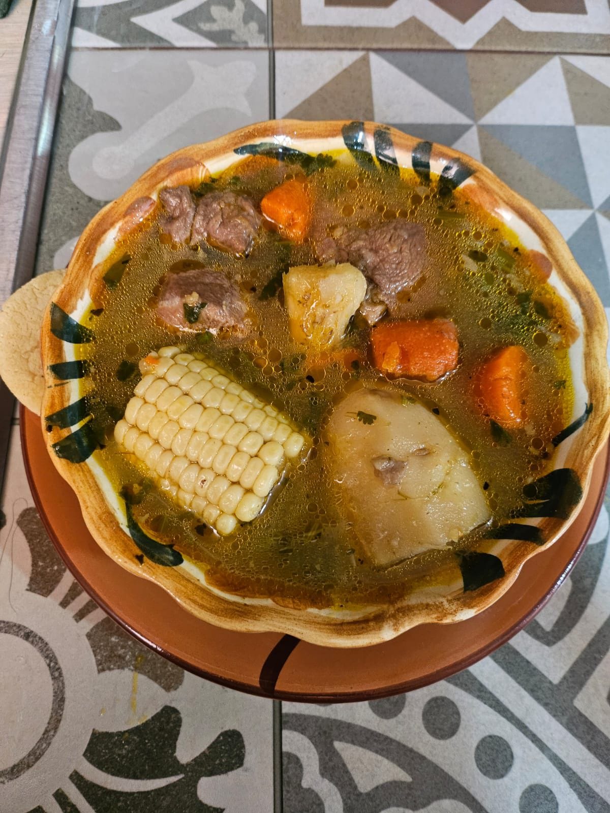 Plato típico de venezuela con carne mechada, verduras y caldo. Ideal para reconfortar y disfrutar los domingos.