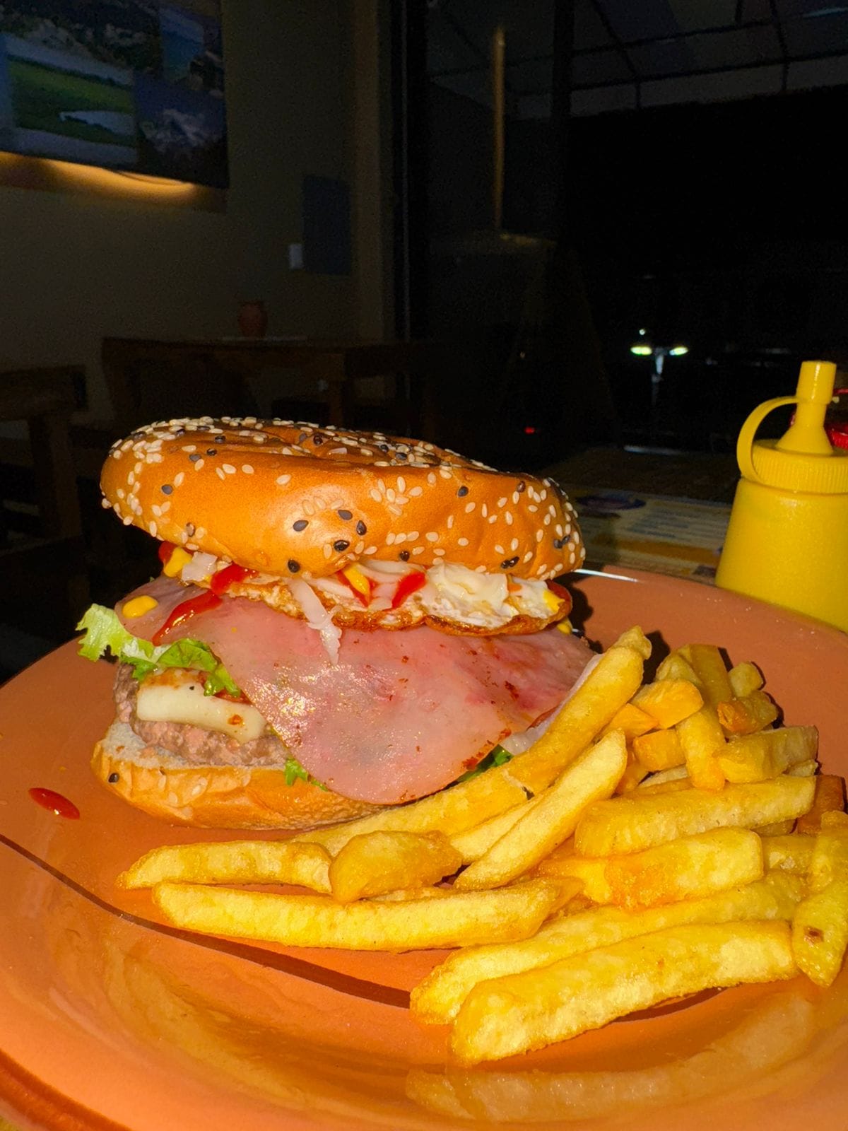 Chuleta ahumada con carne molida de res, queso de mano, huevo frito, tocineta, lechuga, tomate y cebolla.