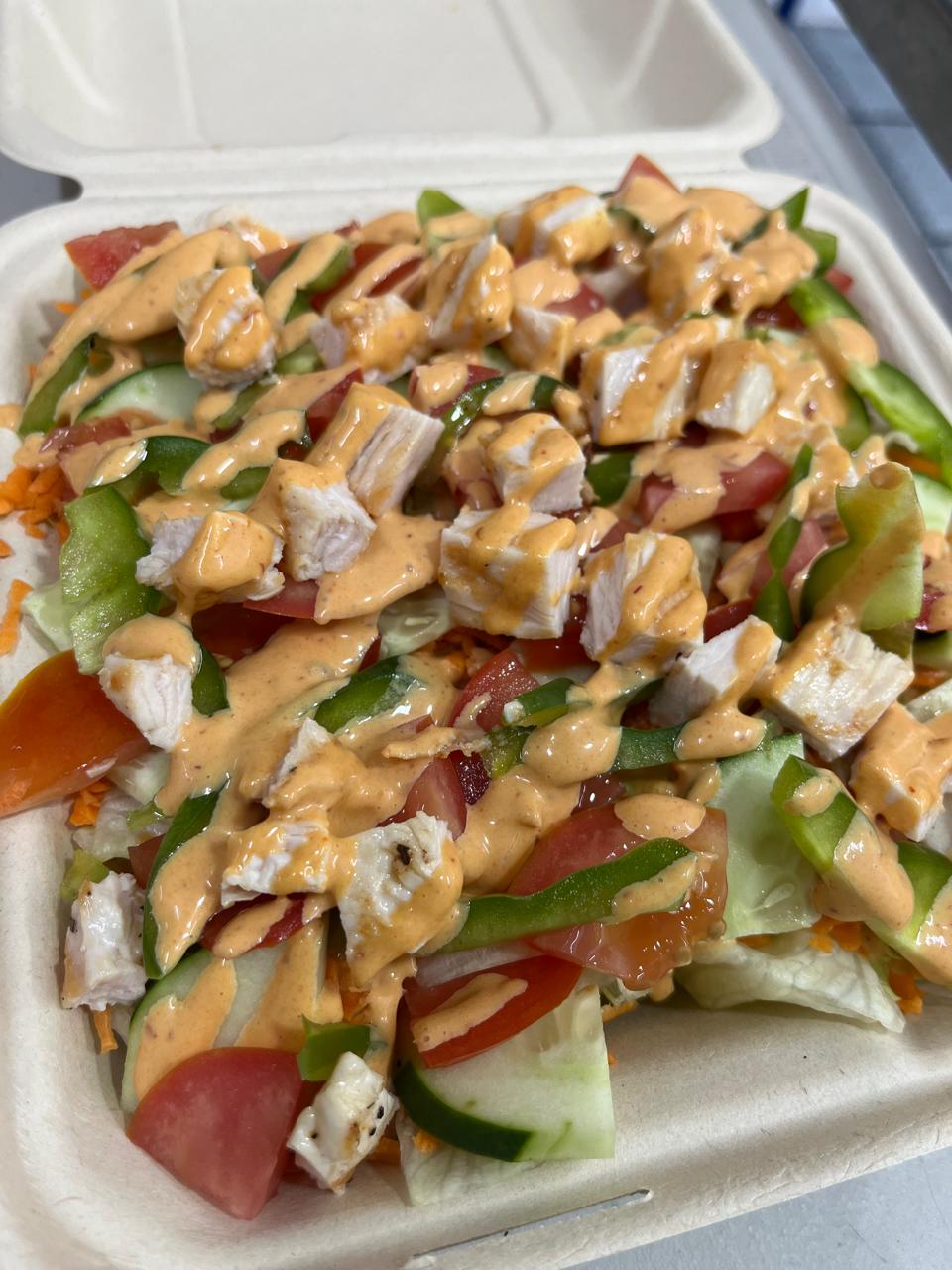 Base de lechuga fresca, zanahoria rayada, pepino persa (tomate bola, pimiento morrón y aderezo de tu elección).