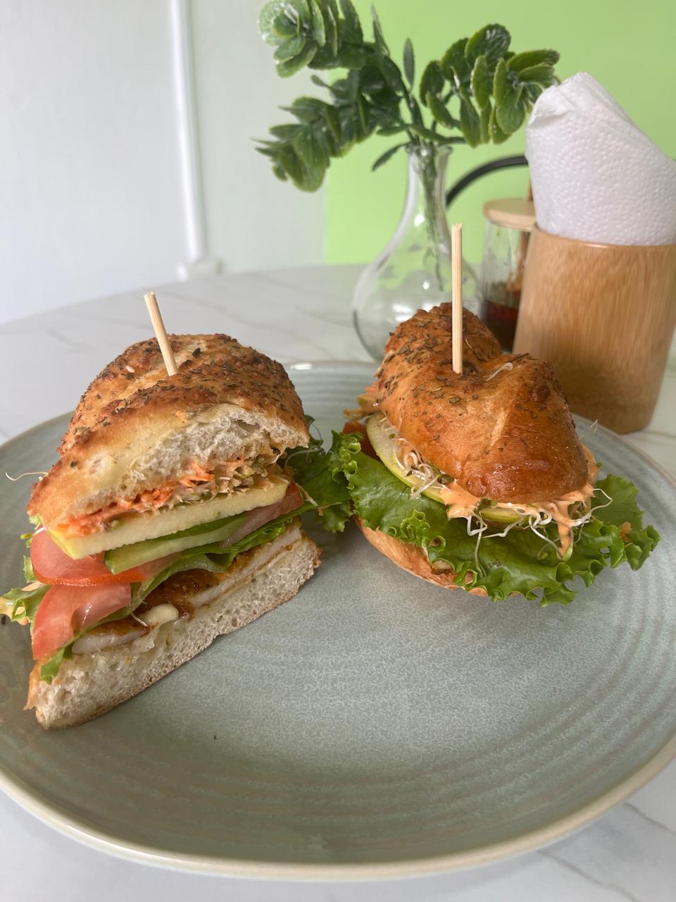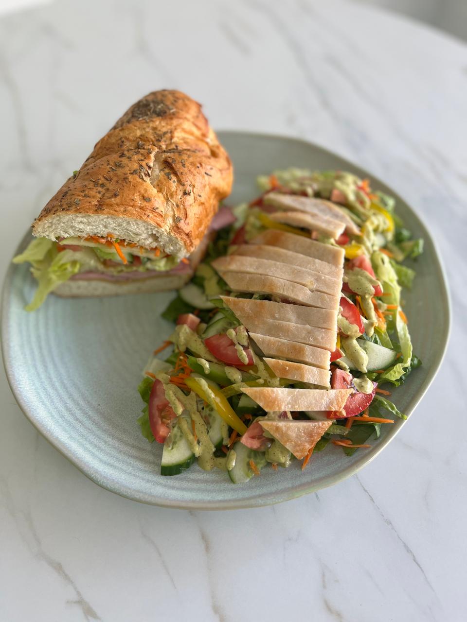 Mayonesa, queso gouda, pechuga de pavo, lechuga fresca, zanahoria rayada, pepino persa, jitomate bola, manzana verde granulada y aderezo de tu elección.