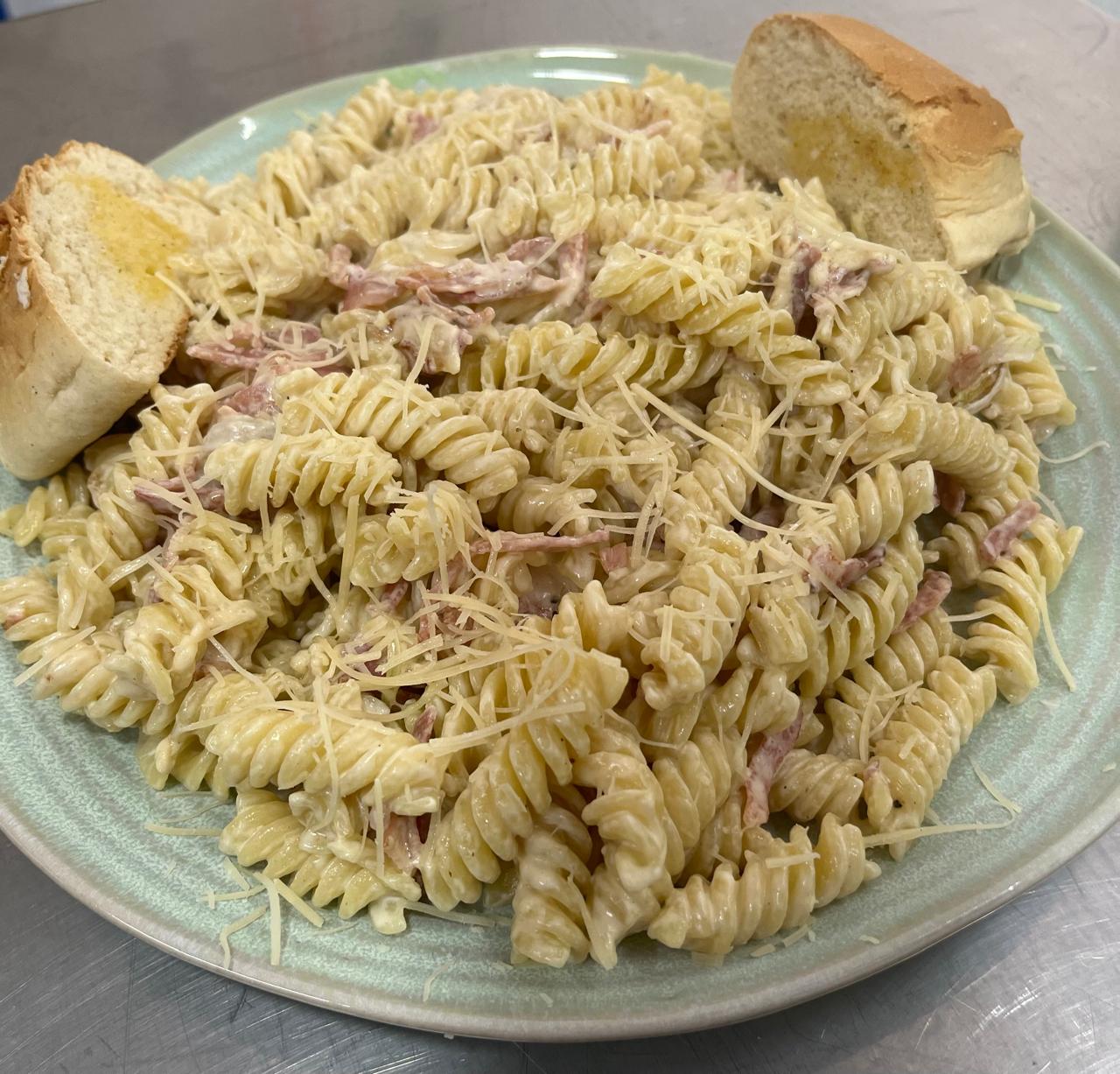 Fusilli con crema, tocino y cebolla caramelizada, coronada con queso parmesano.