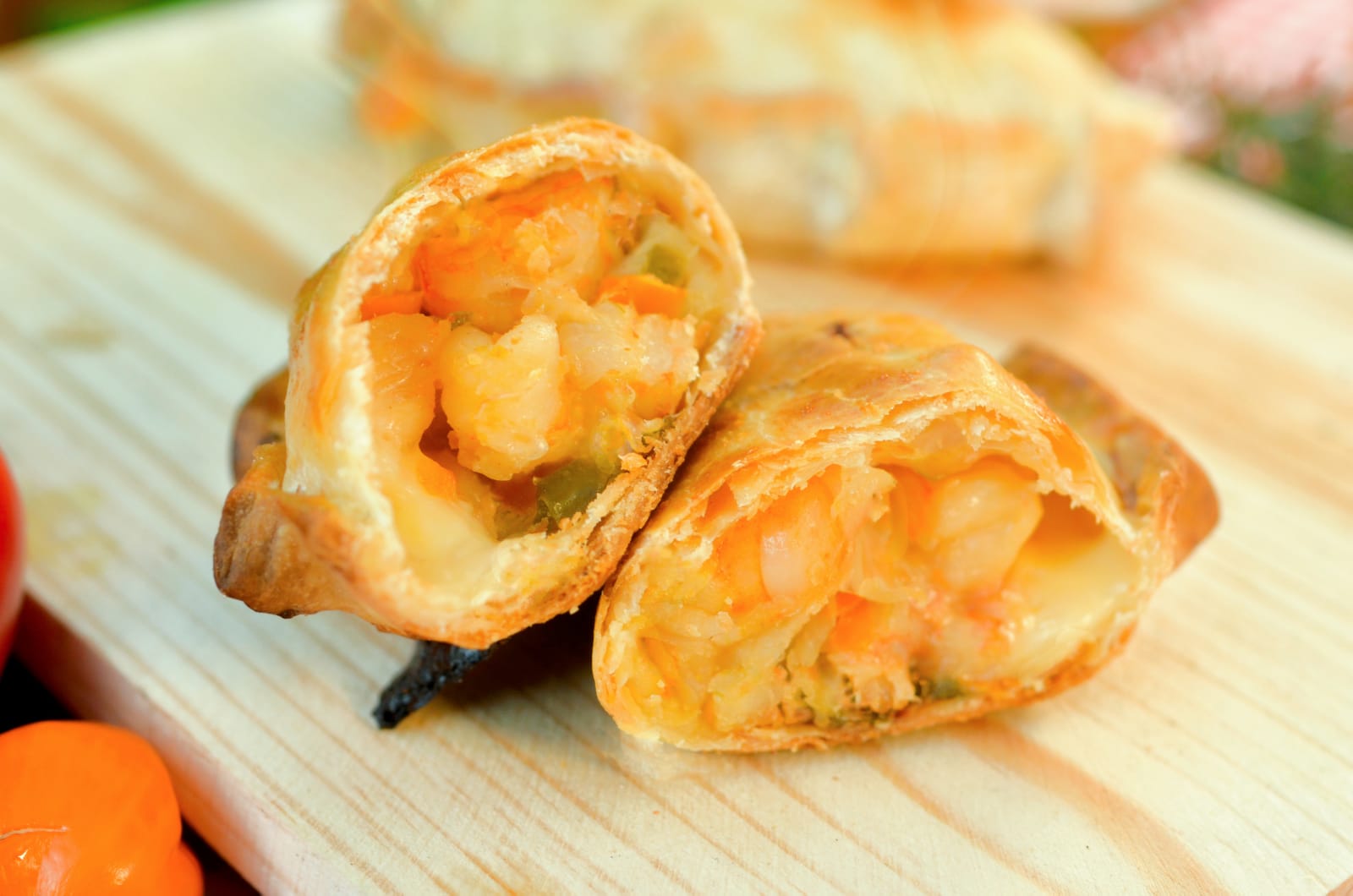 : Empanada en disco de 15 cm de camarones frescos guisados con cebolla, chiles, morrones y finas hierbas, y rellena de queso mozzarella.