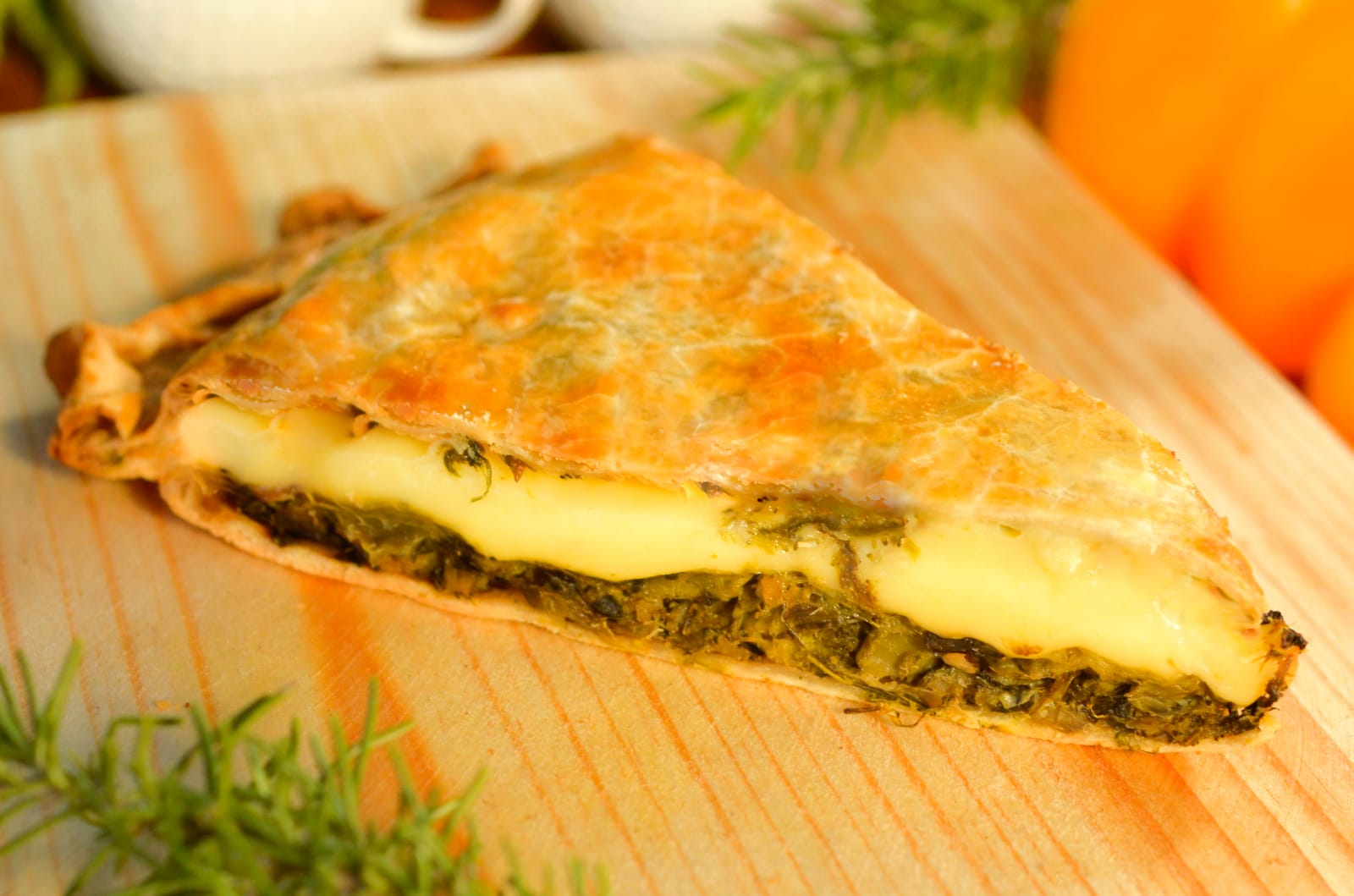 : Empanada en disco de 15 cm de marlin ahumado fresco, guisado con cebolla, chiles, morrones y finas hierbas, y rellena de queso mozzarella
