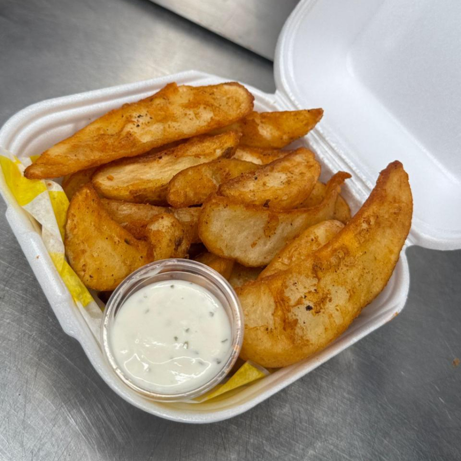 ALITAS DE POLLO BAÑADAS EN SALSA DE ELECCIÓN ACOMPAÑADAS CON PAPAS A LA FRANCESA.