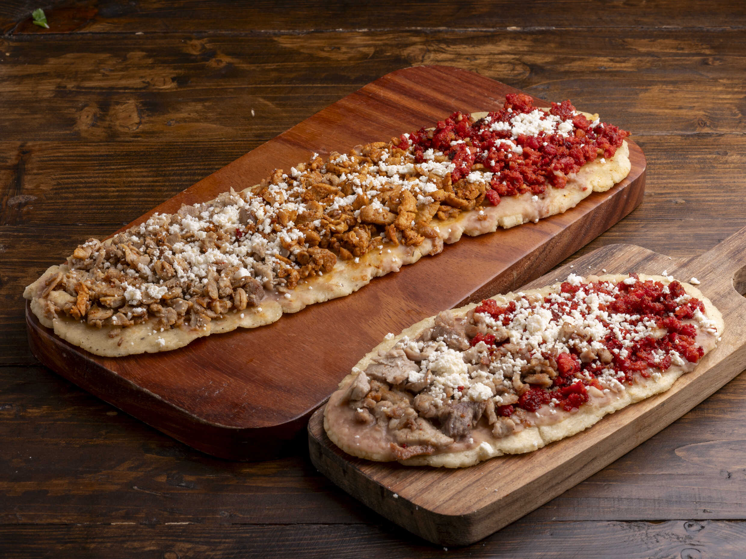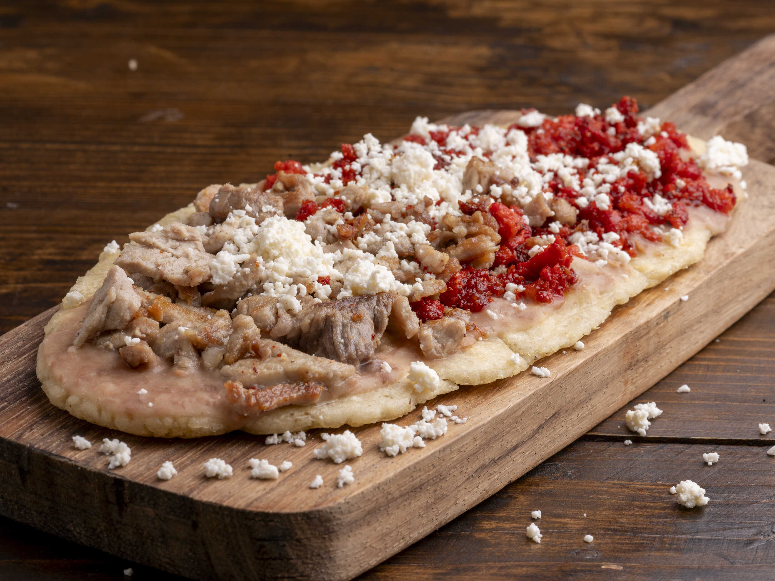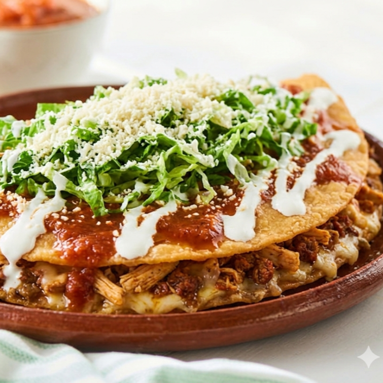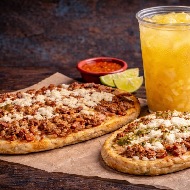 Chico 23 cm, Mediano 27cm Grande 35cm. 2 carnes a elegir, sobre una delgada capa de masa sobre una ligera cama de frijolitos.