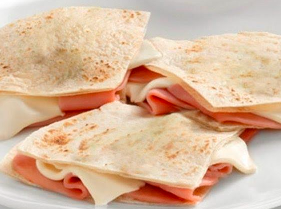 Tortilla de harina grande con queso y jamon acompañada de lechuga y jitomate con aderezos