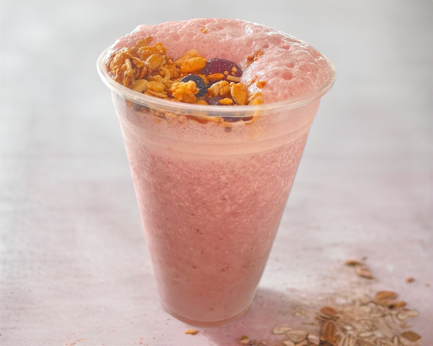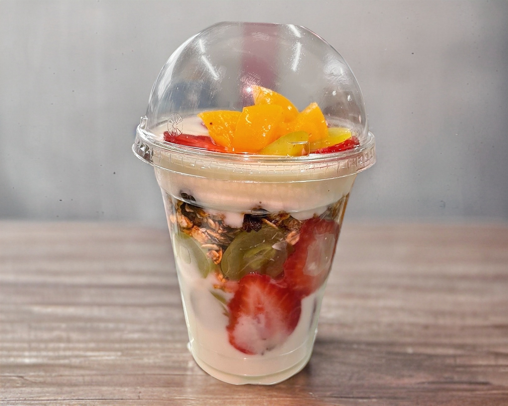 14 oz, Fruta preparada en un vaso con yogurth naturaleza y granola.