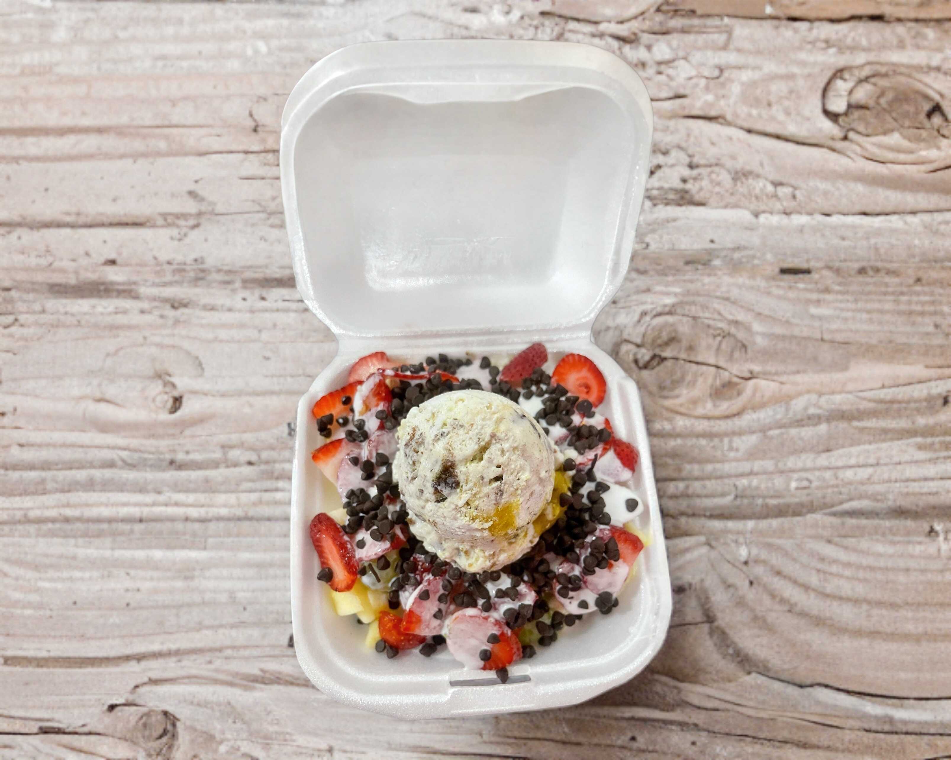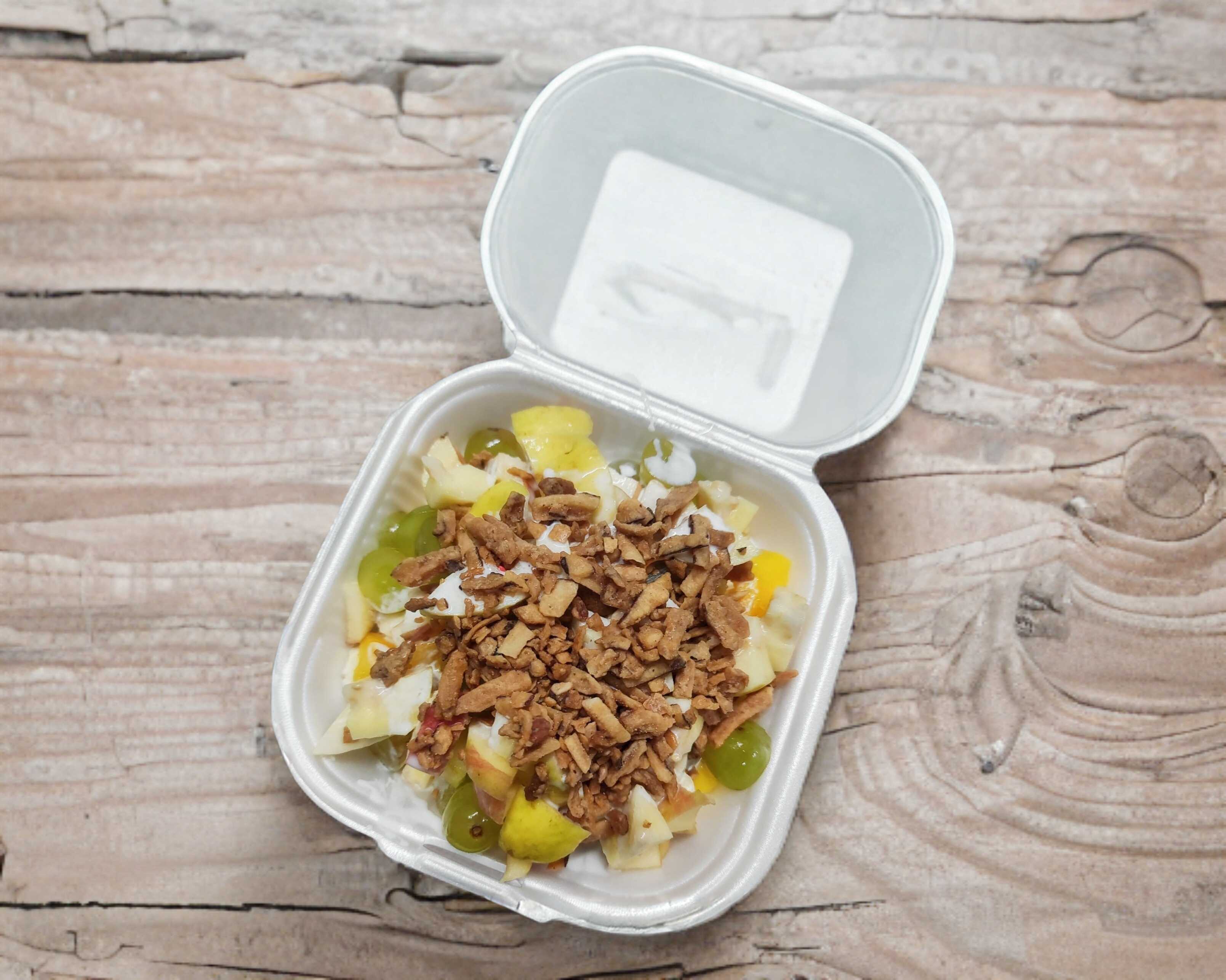 Fruta del día a elegir fresa,plátano,papaya,melon,manzana preparada con yogurth natural y algún cereal