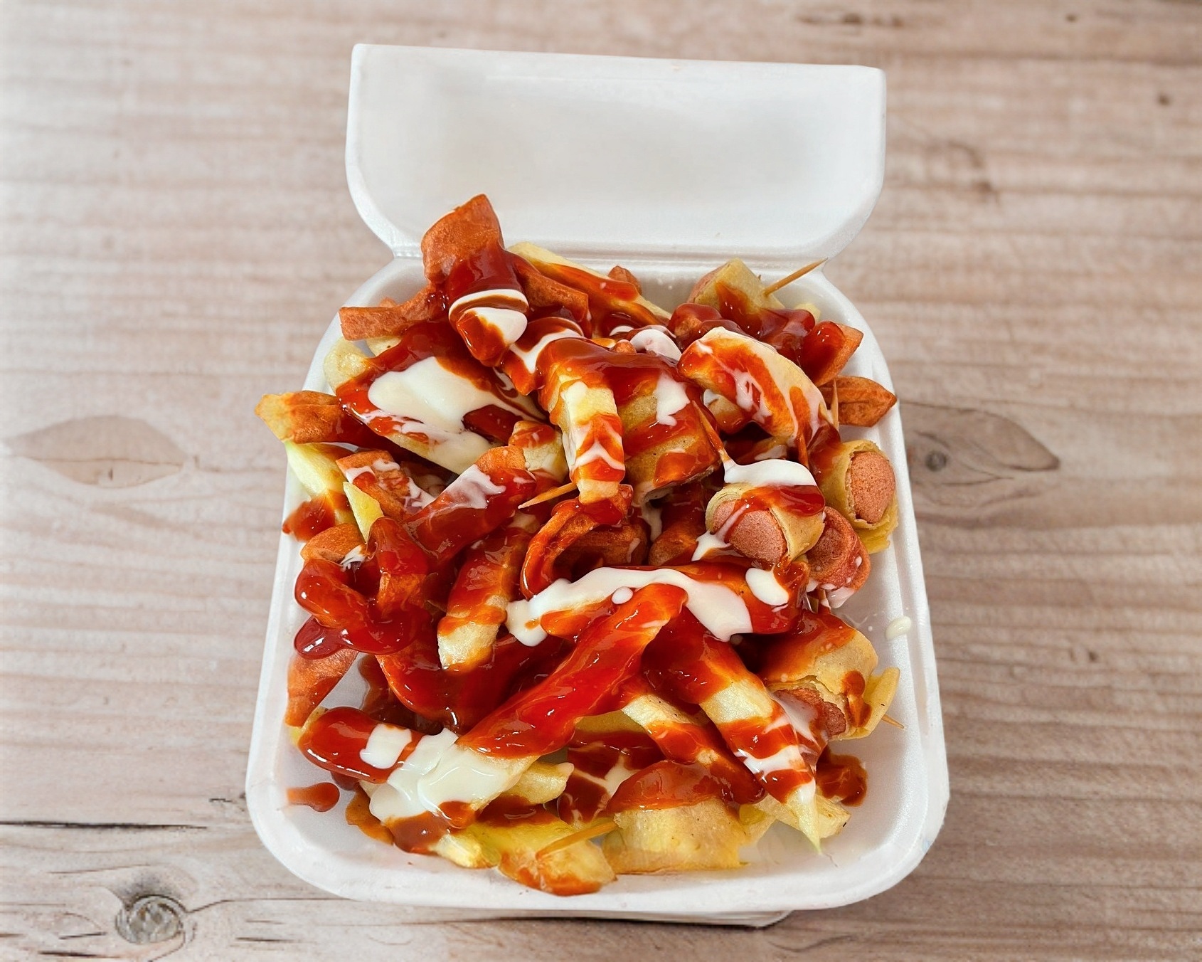 plato Grande de salchipulpos combinados, con papas ala francesa, salchipulpos y salchitacos preparados con, captsu, mostaza, crema y chile