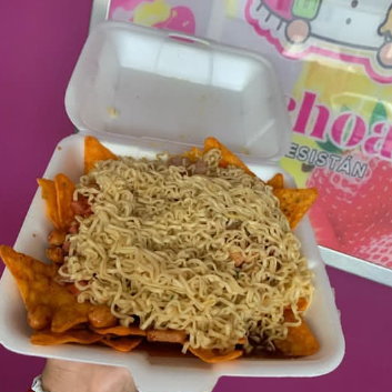 Maruchan con Tostitos, preparado de jícama, pepino, cueritos, salchicha, cacahuates, rielitos y mezcla de salsas.