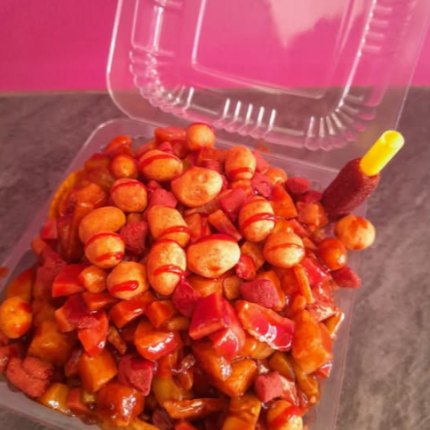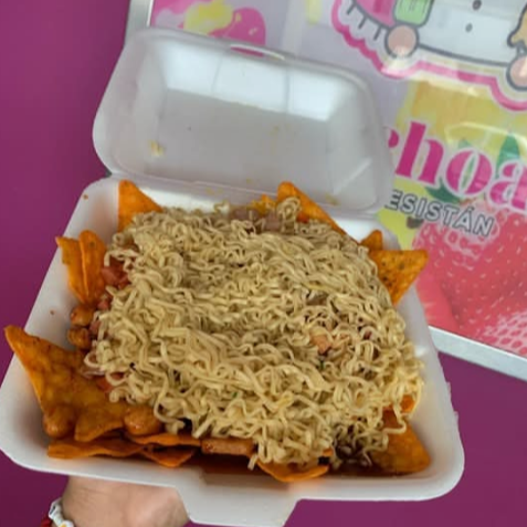 Maruchan con Tostitos, preparado de jícama, pepino, cueritos, salchicha, cacahuates, rielitos y mezcla de salsas.