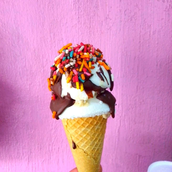 Delicioso cono de galleta con dos porciones de tu helado o nieve favorita