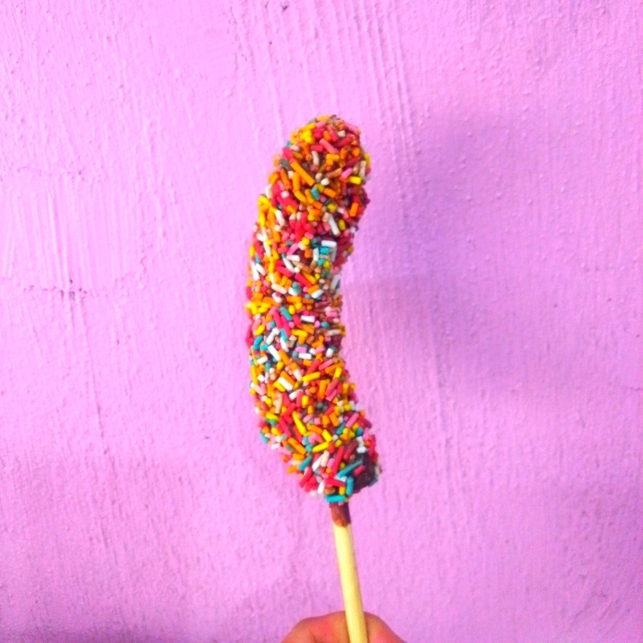 Postre a base de plátano preparado con complementos dulces de la casa
