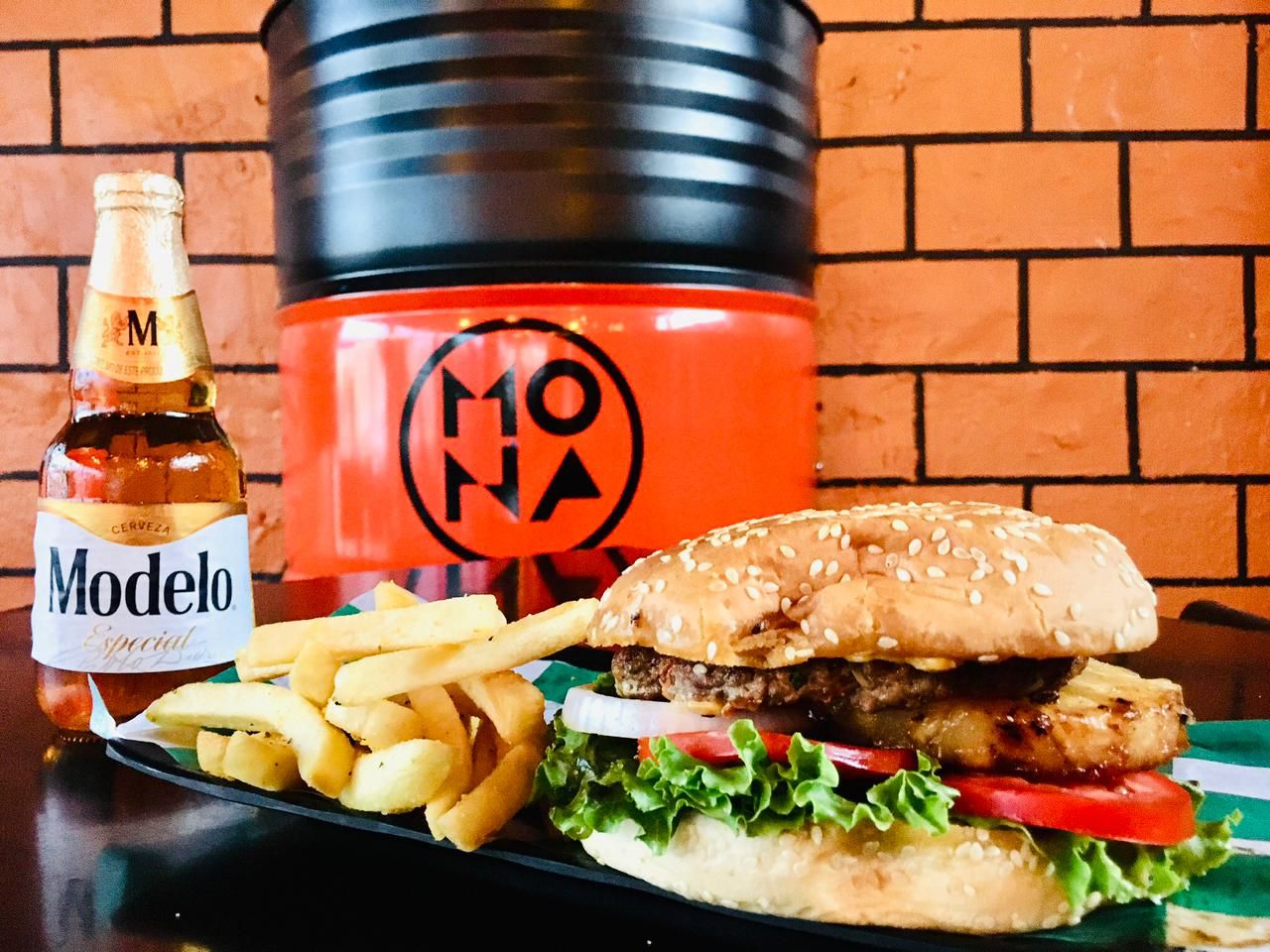 Deliciosa Hamburguesa preparada con carne de res, cebolla, jitomate, pina, lechuga y papas a la francesa, mayonesa y mostaza, aparte.