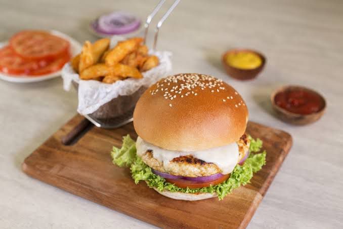 Deliciosa Hamburguesa preparada con carne de pollo, cebolla, jitomate, pina, mayonesa y mostaza aparte.