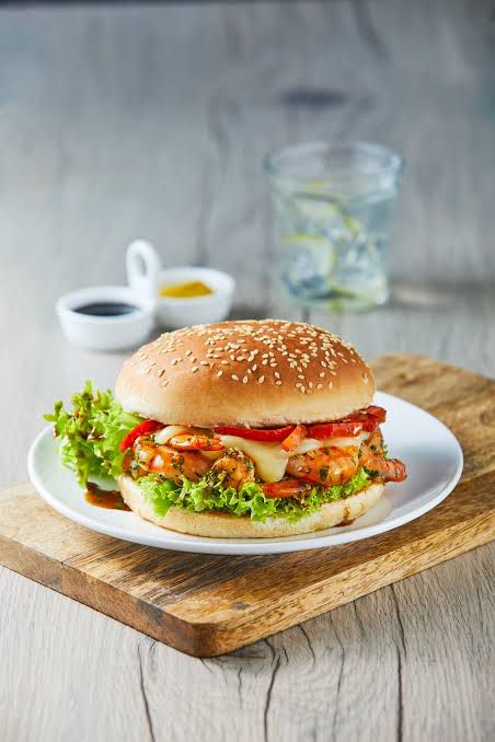Deliciosa hamburguesa con camarón, queso mozarella, pina, cebolla y jitomate, mostaza y mayonesa aparte.