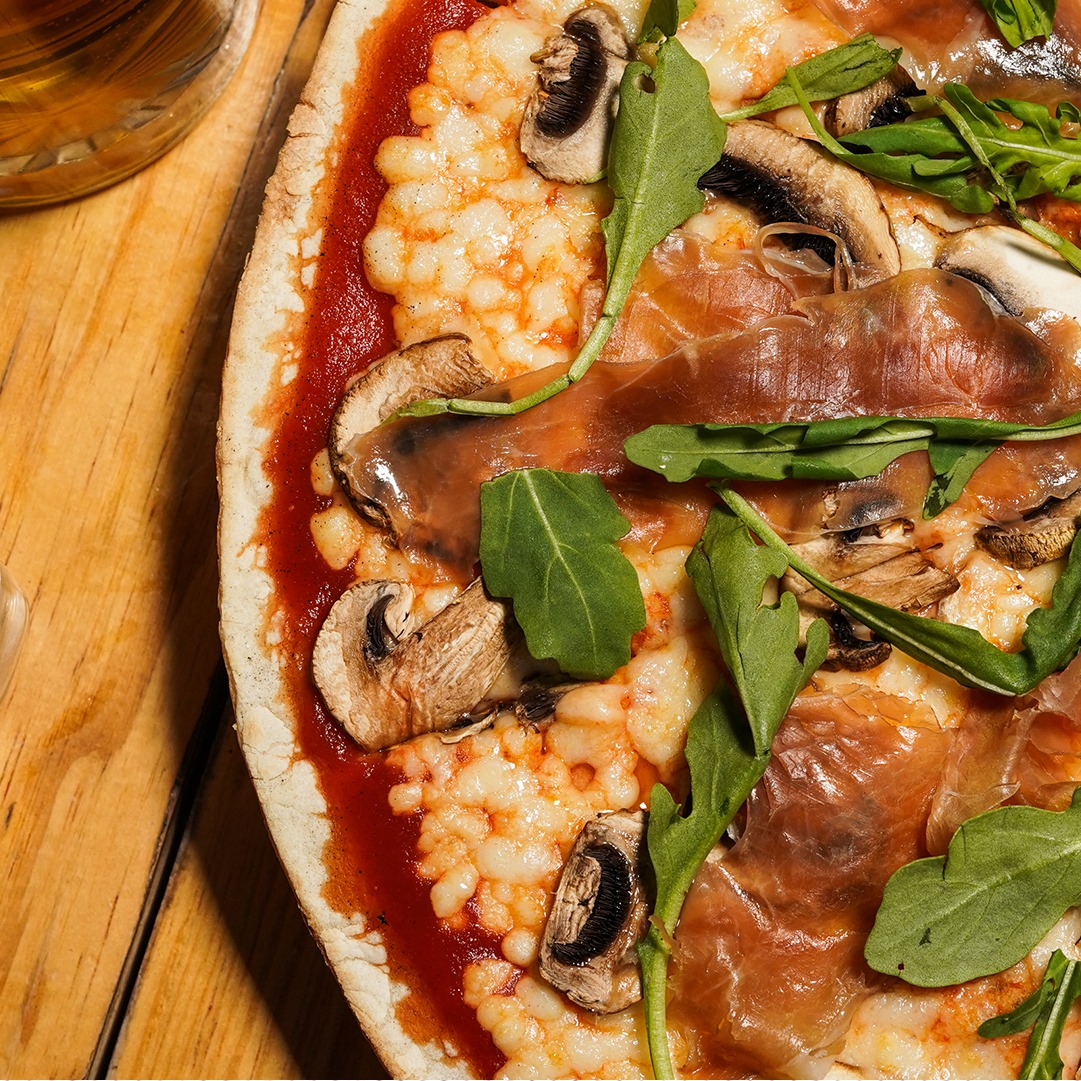 Champiñones, jamón serrano y arúgula.