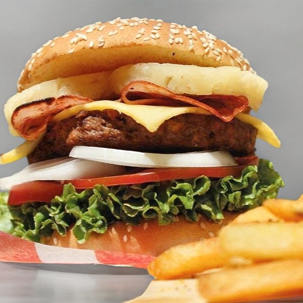Aros de cebolla, BBQ, queso manchego, lechuga, jitomate, cebolla y aderezo ranch. Papas a la francesa gratis.