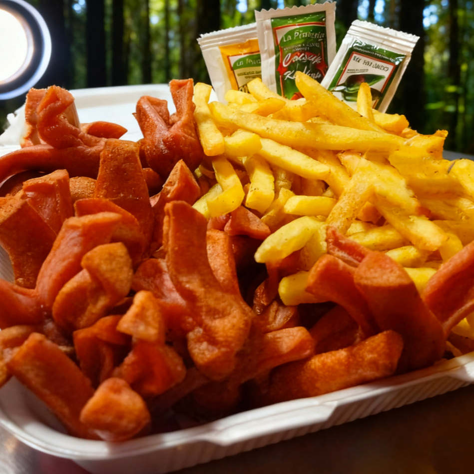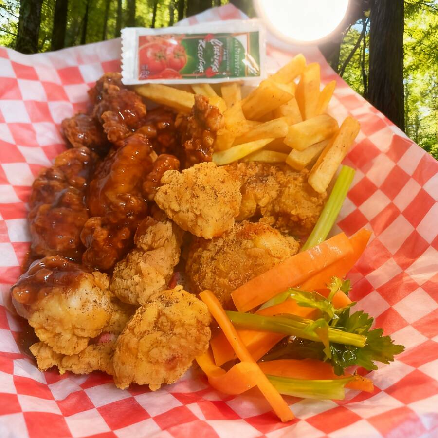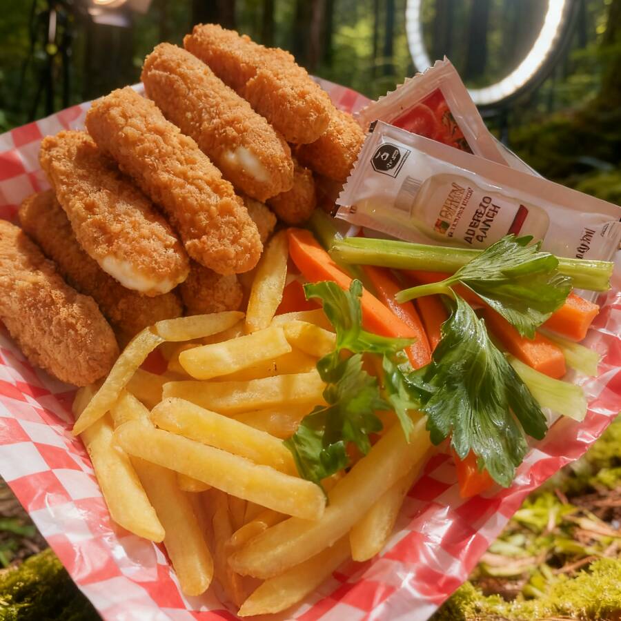 Boneless pollo/pechuga fritos con salsa a elección, 150 gms de papa francesa acompañados de zanahoria c/apio y ranch.