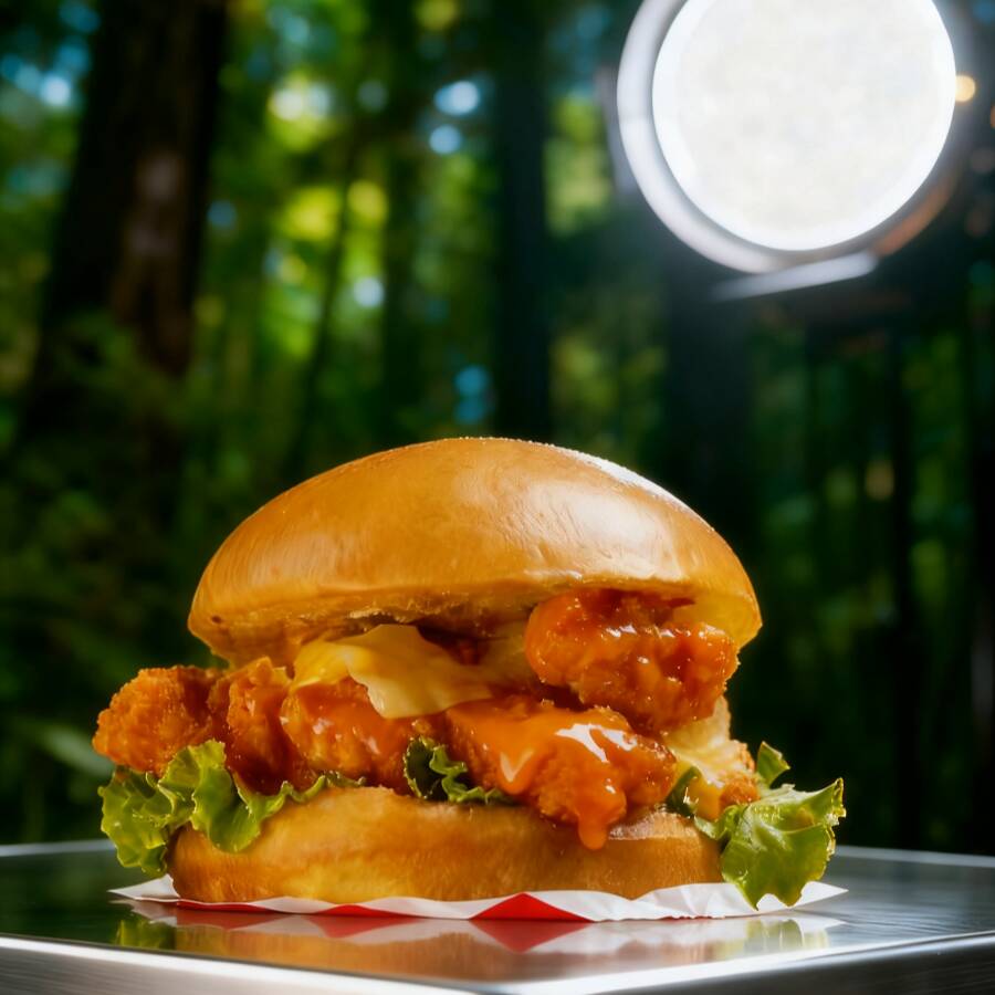 Hamburguesa de boneless con salsa Buffalo queso blanco lechuga jitomate cebolla morada y aderezo mayoketchup