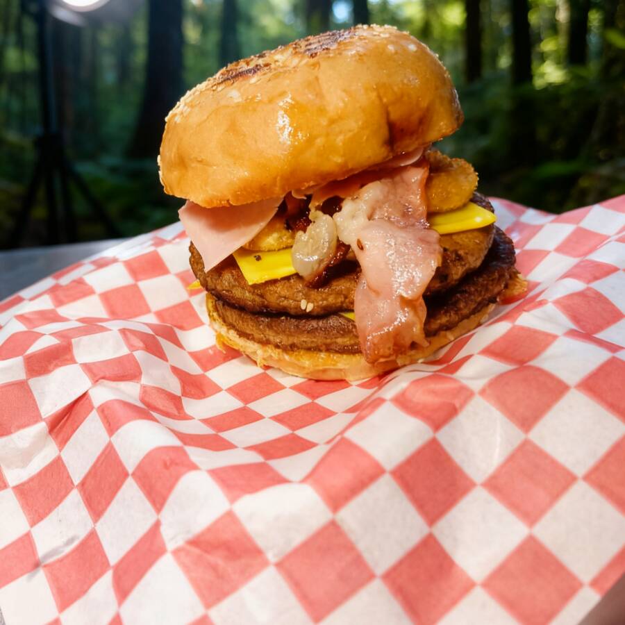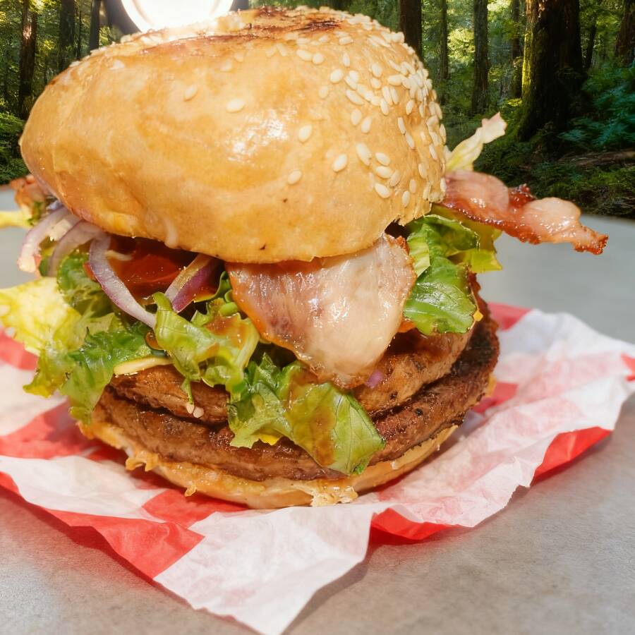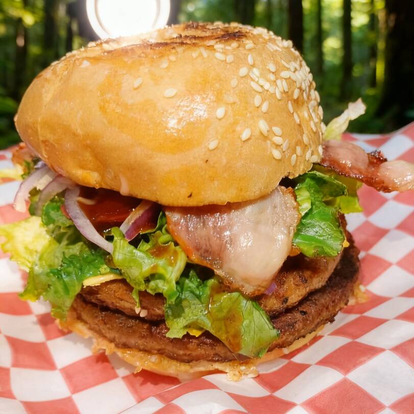2 carnes 2 quesos amarillo lechuga jitomate cebolla morada en julianas bbq y aderezo mayoketchup