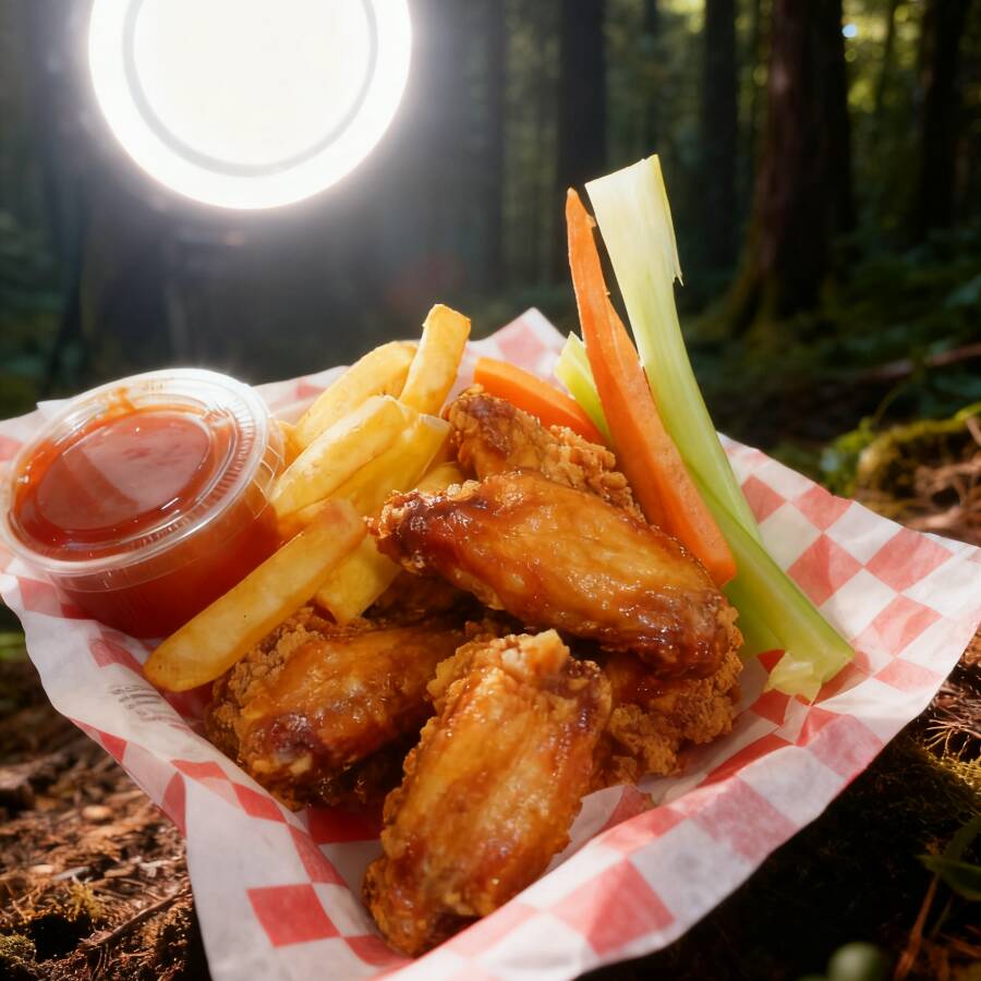 1 kg de alitas fritas con 2 sabores salsa a elección 150 gms de papa francesa acompañadas de zanahoria fresca/apio y ranch