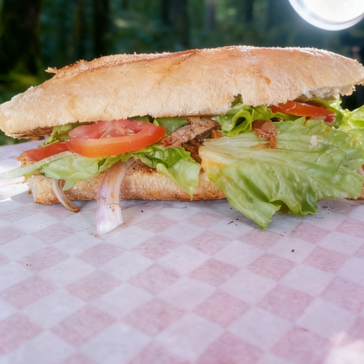 Carne tocino aro de cebolla queso blanco jitomate lechuga cebolla morada en julianas con toque de salsa bbq y aderezo