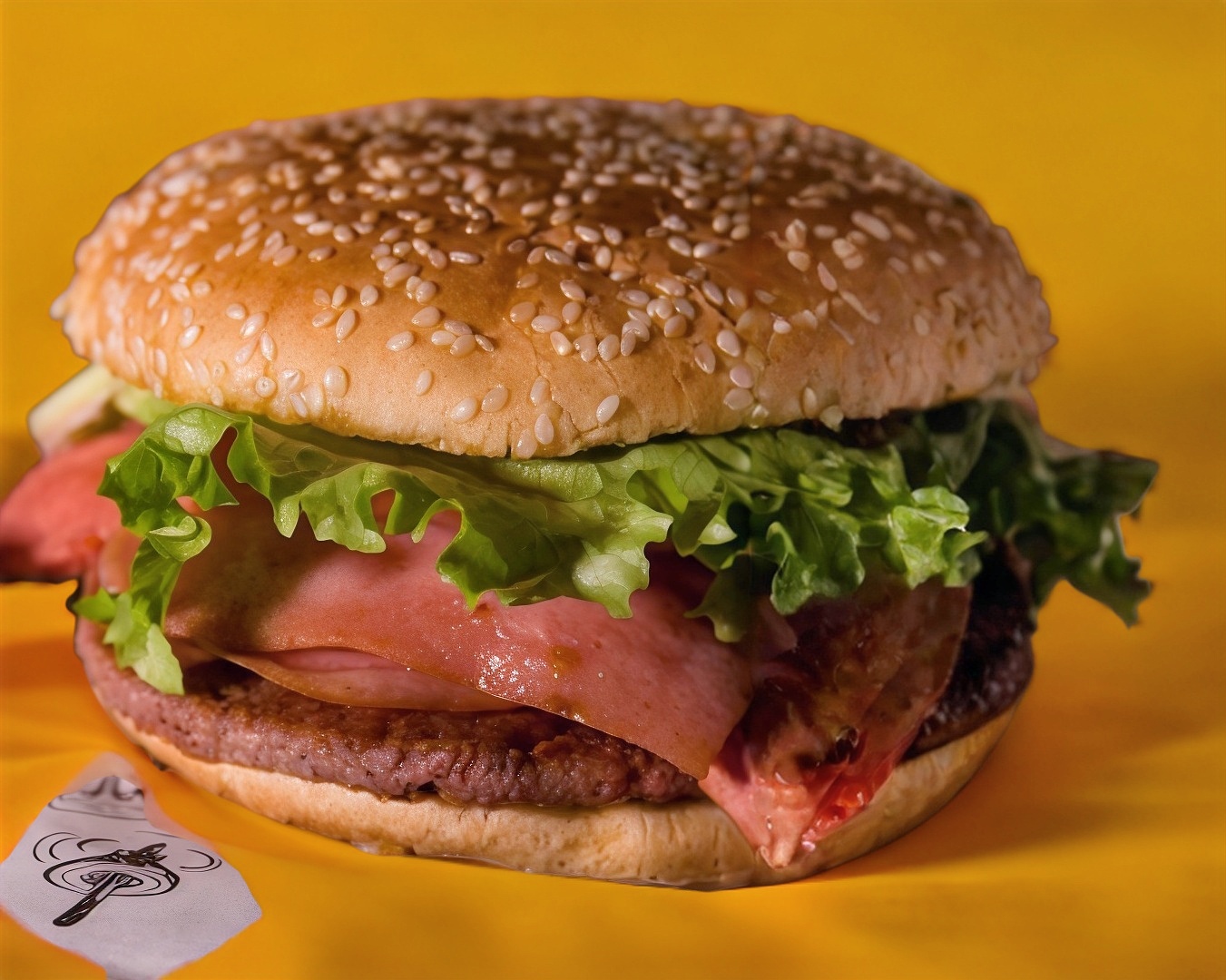 Carne de res, jamón, tocino, queso amarillo acompañado de papas.
