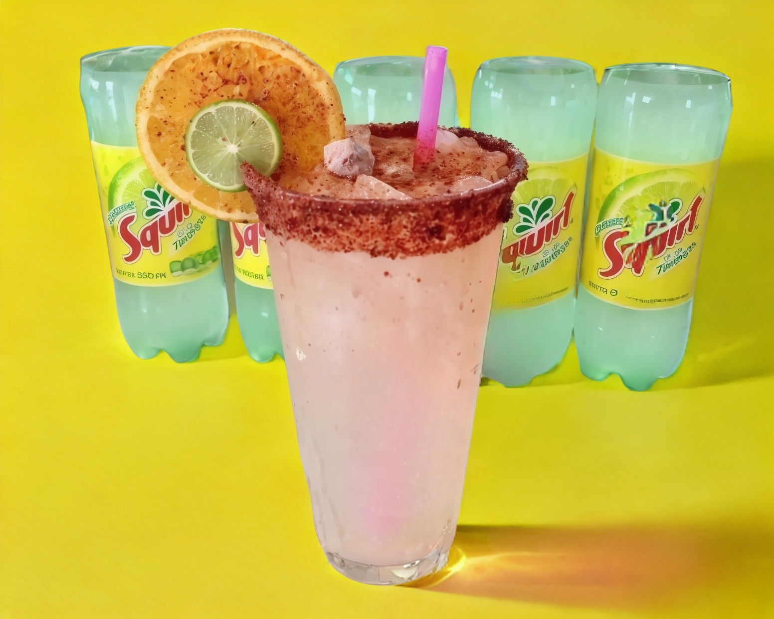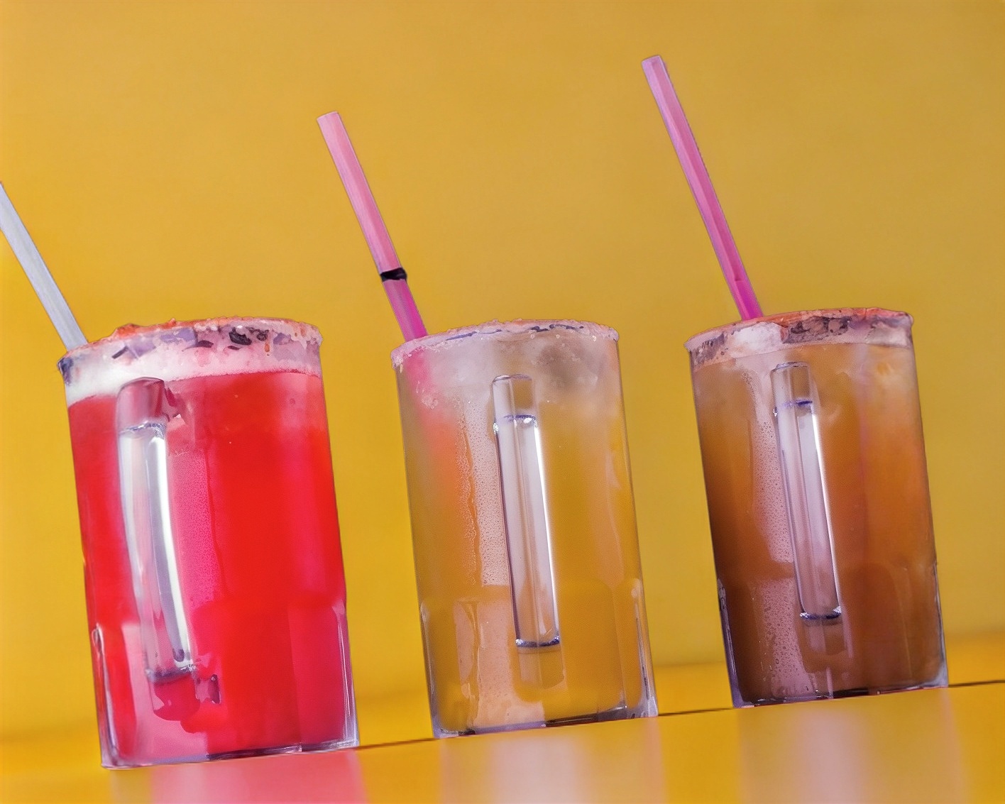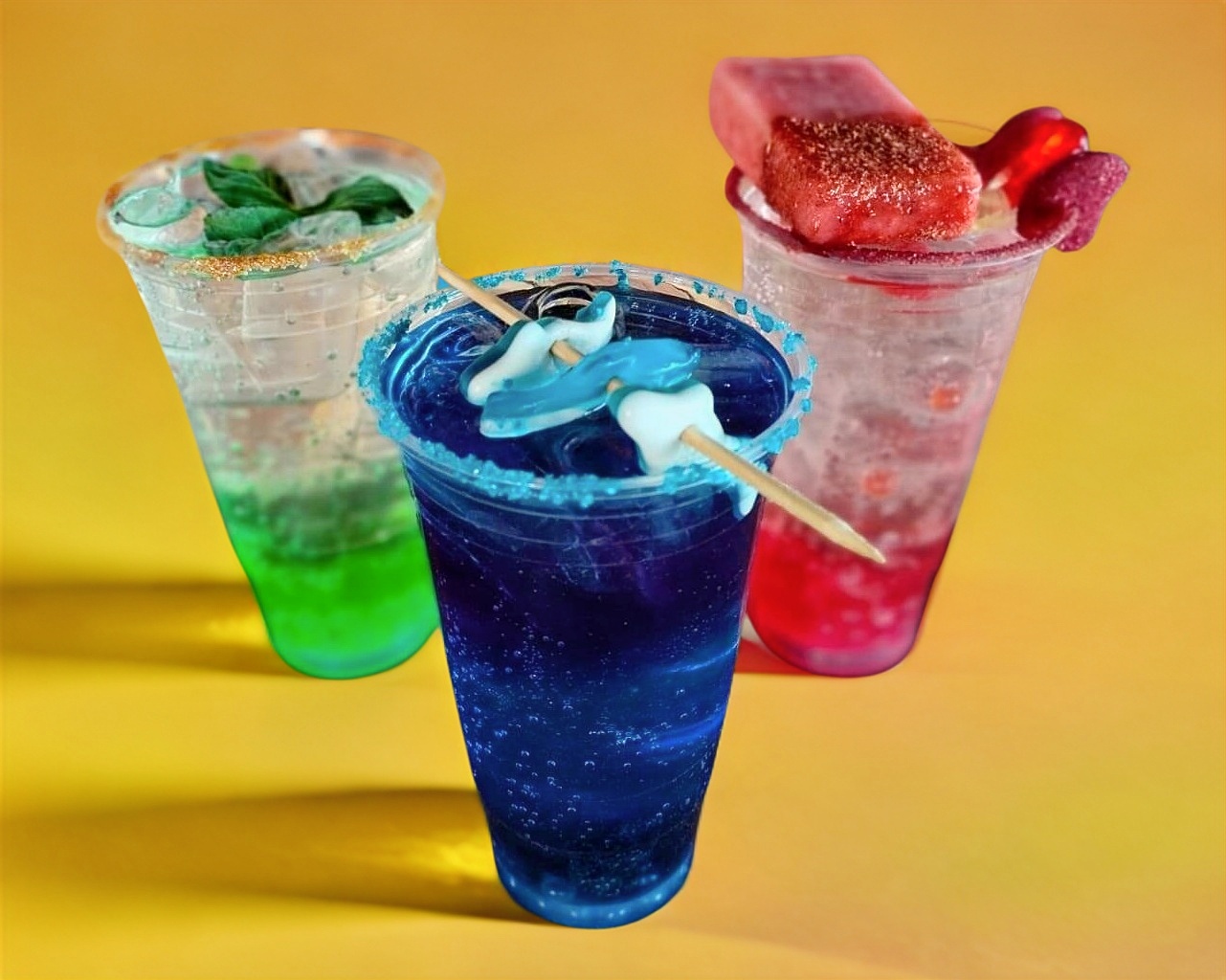 Refrescante litro con jarabe de frambuesa, perlas explosivas, ron y gomitas