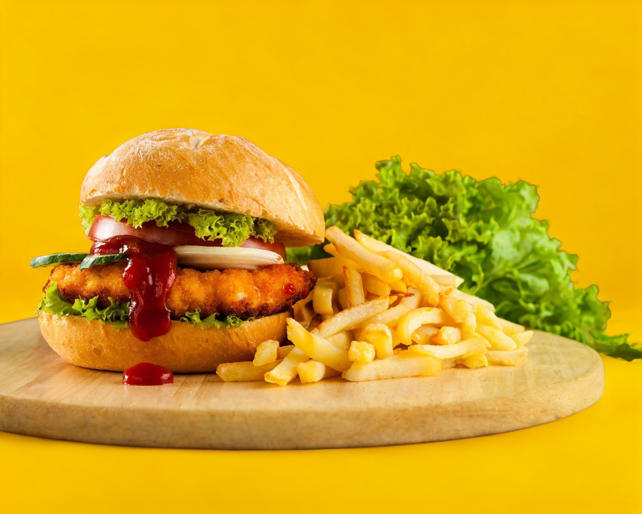 Milanesa de Pollo, queso fundido, jitomate, cebolla, lechuga, salsa cátsup y jalapeño, acompañada de papas a la francesa.