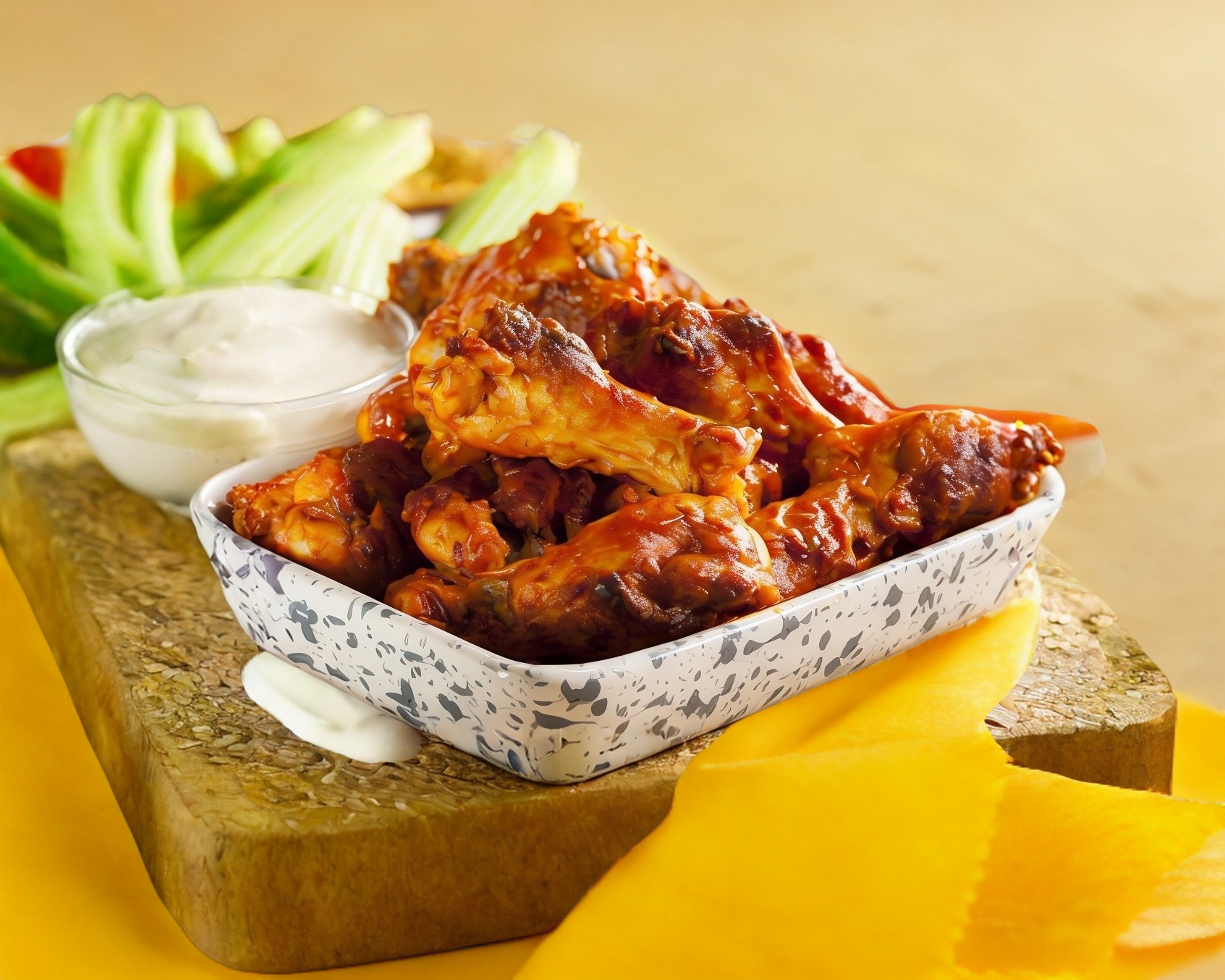 10 Pzs Aprox. bañadas en tu salsa favorita, acompañados de zanahoria, apio y un aderezo ranch.