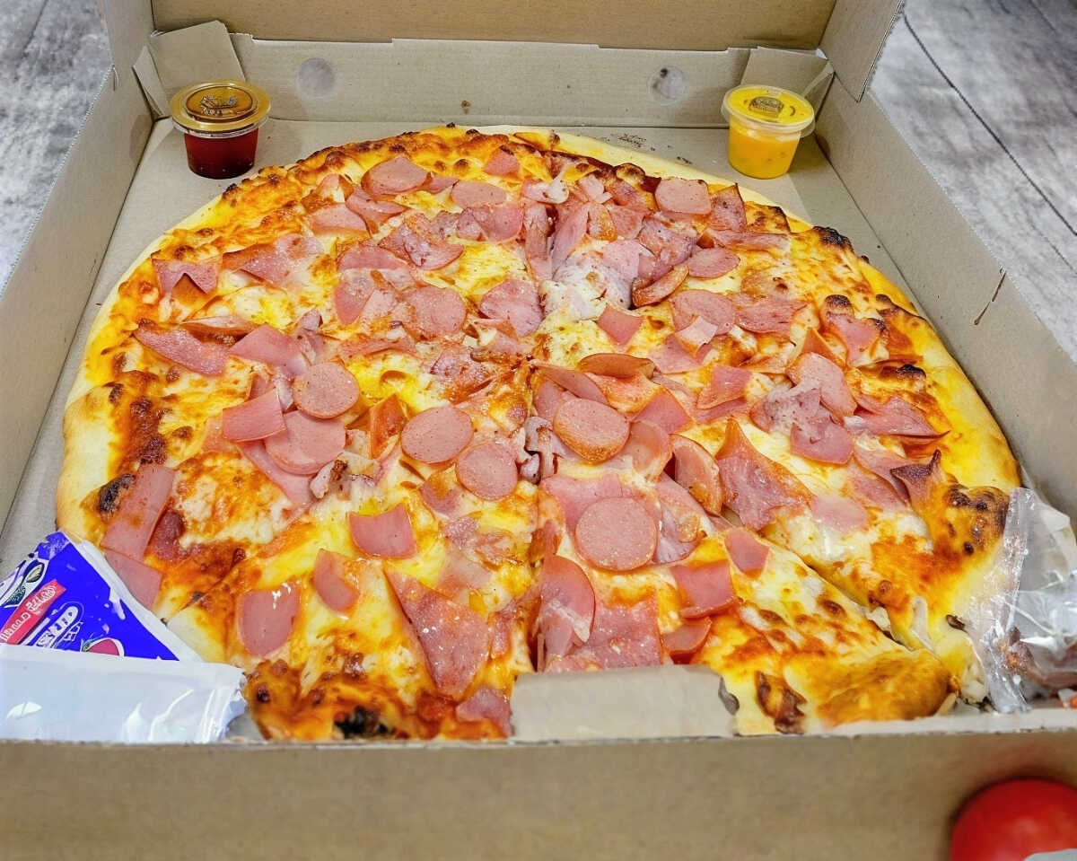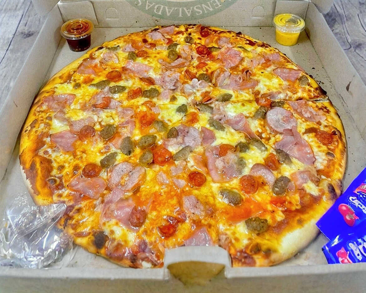 Pizza con tocino, salami, chistorra, chorizo argentino y carne molida