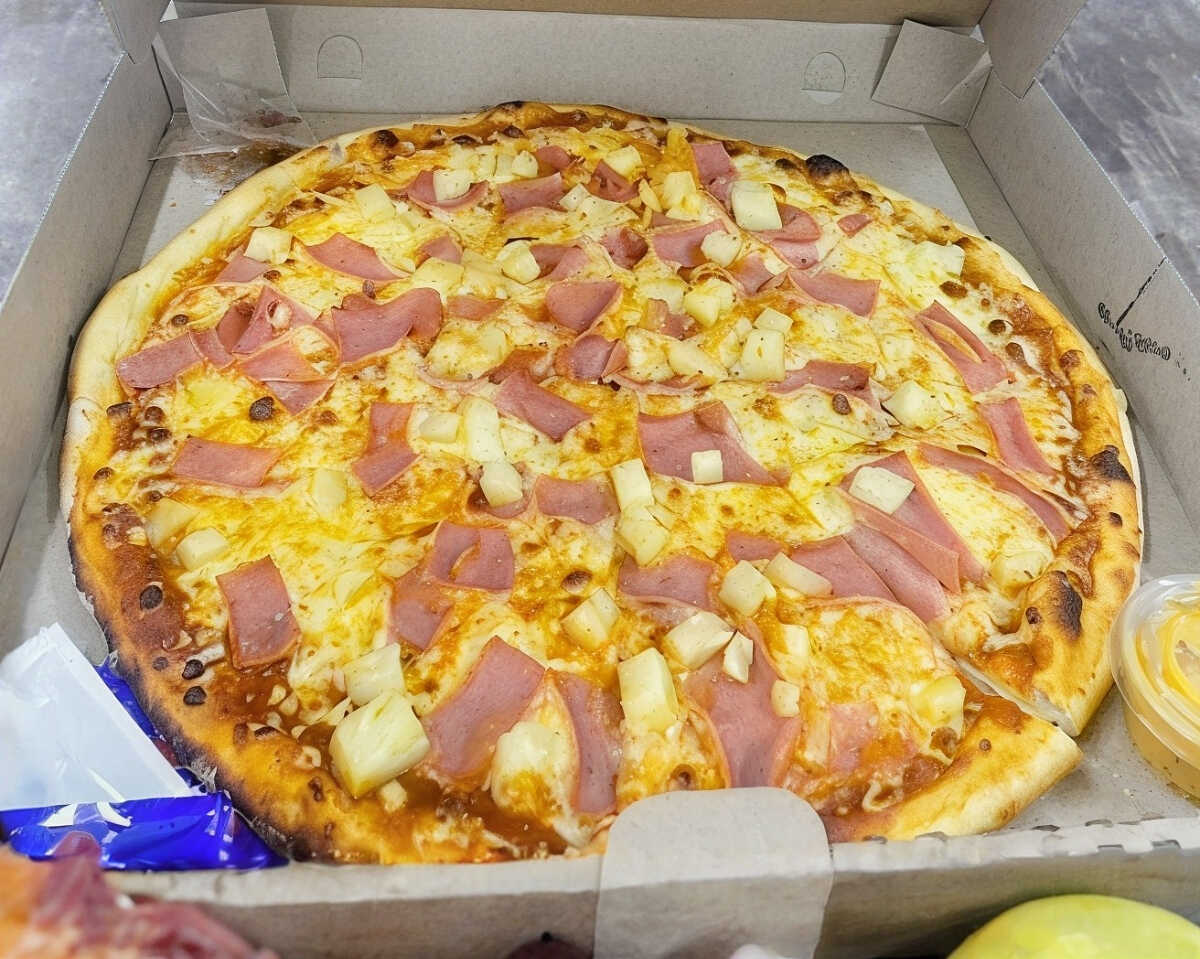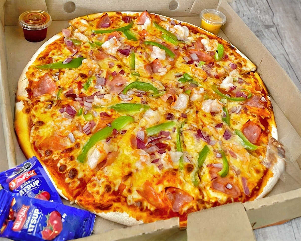 Camarón, aceituna negra , pimiento morron, cebolla y queso gouda