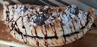 Calzzone gigante relleno de chocolate y frutas de temporada bañado con fudge de chocolate.