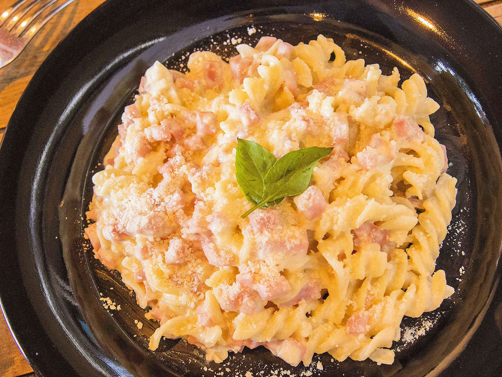 Fettuccine salteada con nuestra crema alfredo, jamón y queso parmesano.