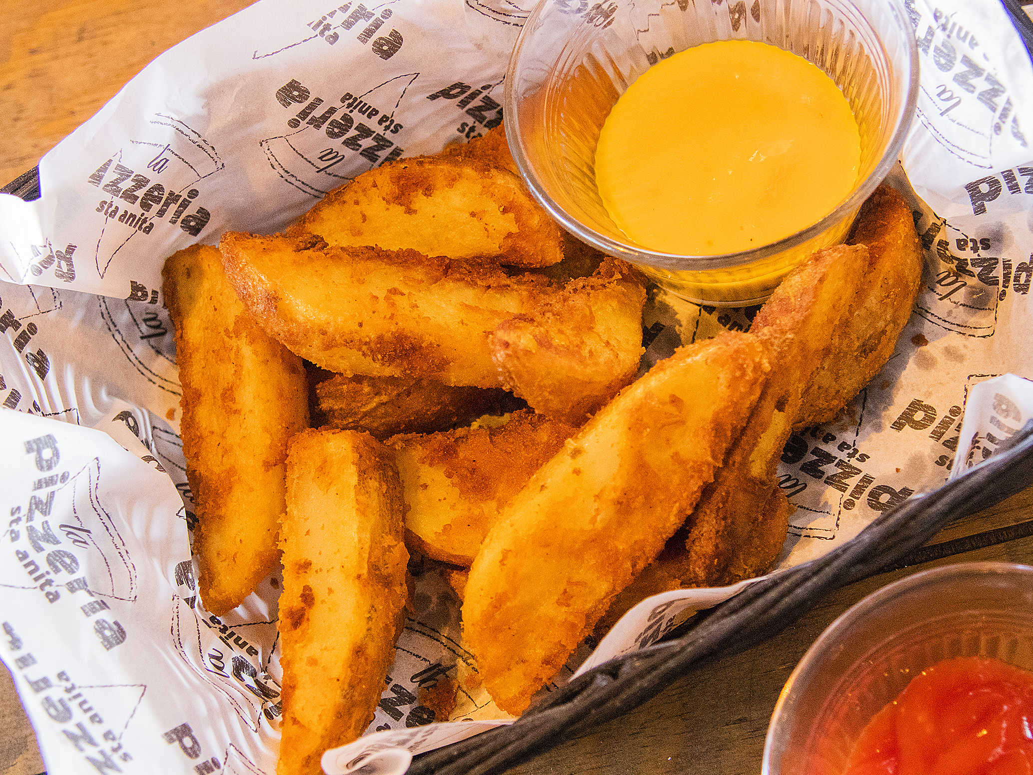 Pizza 2 ingredientes, papas a la francesa y 2 refrescos.