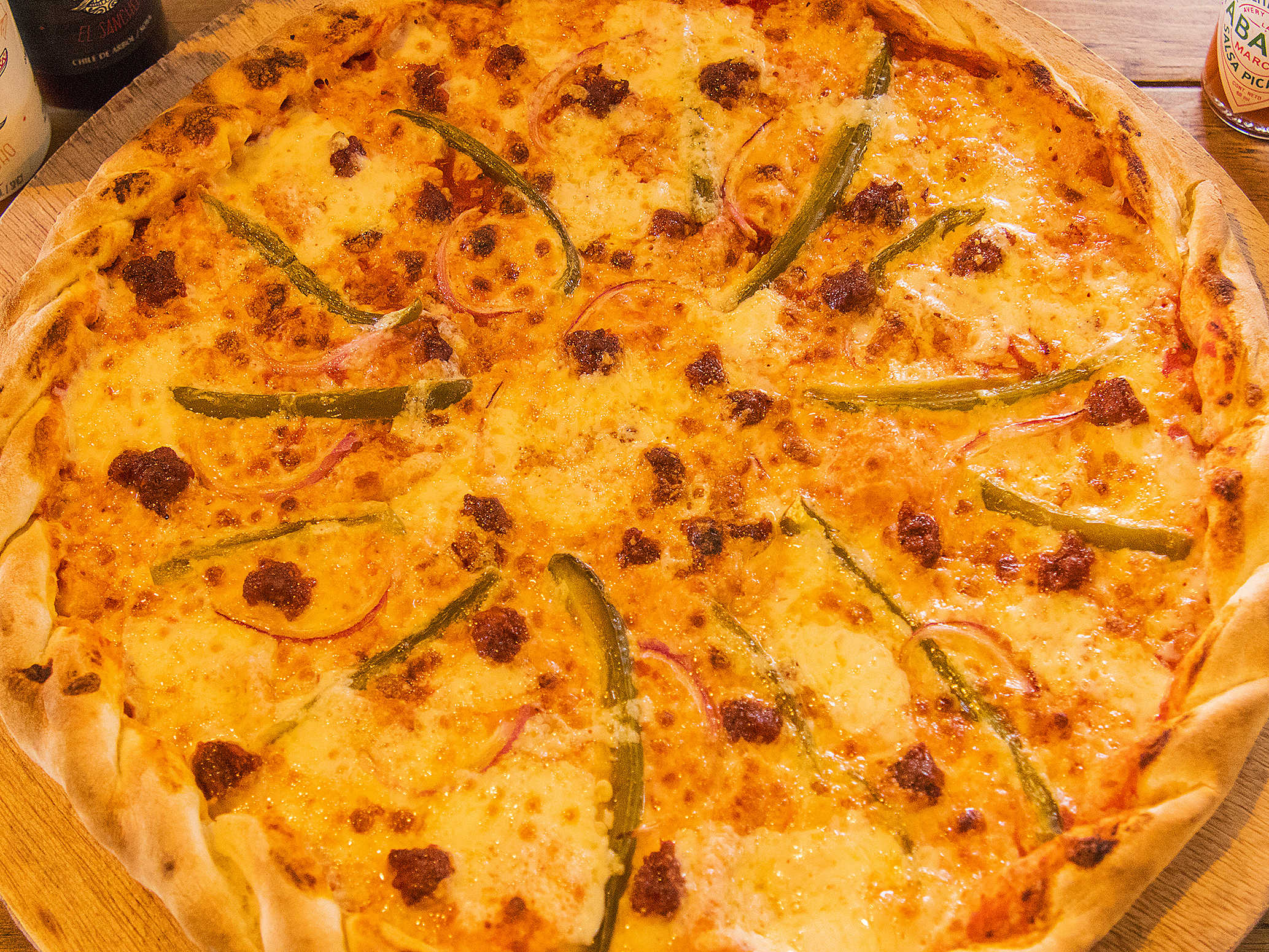 Chorizo, cebolla y jalapeño. Horneadas a la leña, de 35 centímetros.