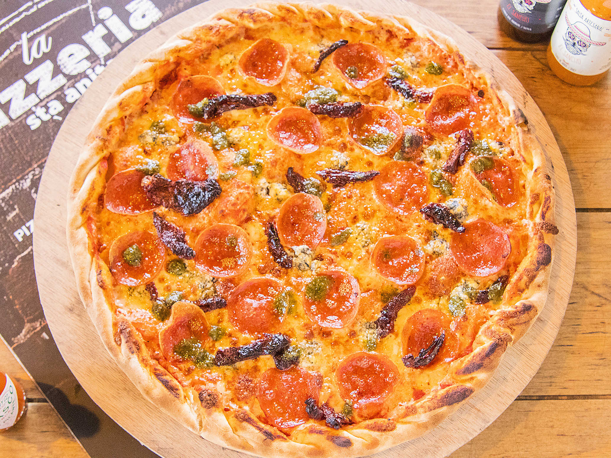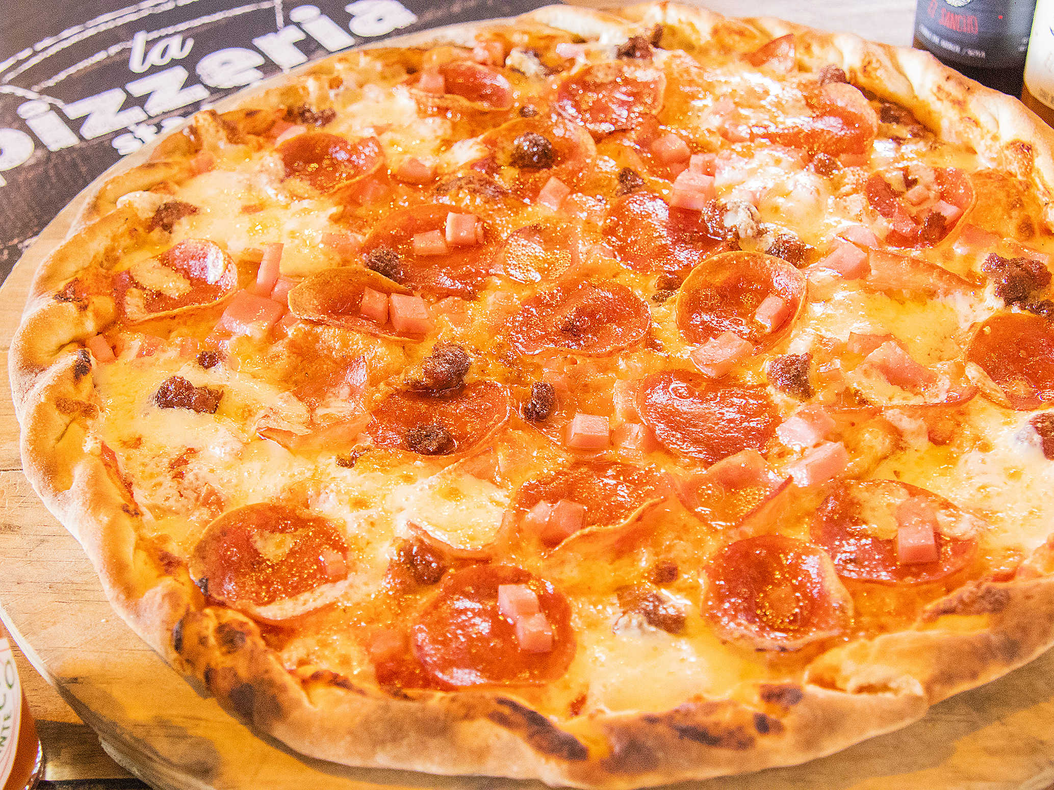 Salami, pepperoni, salchicha italiana y jamón. Horneadas a la leña, de 35 centímetros.