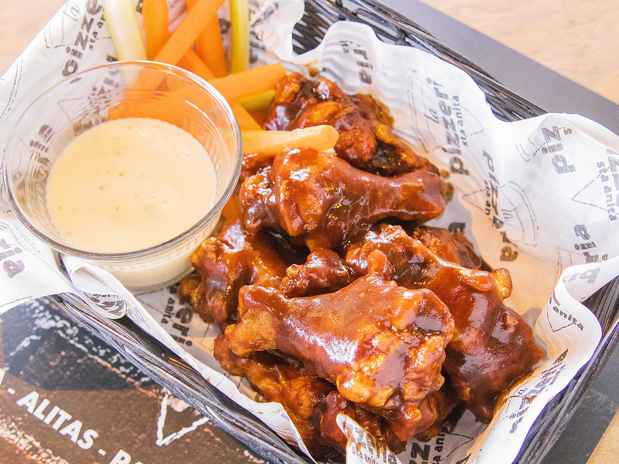 Jugosas alitas de pollo bañadas con deliciosa salsa agridulce de la casa con un ligero sabor ahumado. Acompañadas de frescos vegetales y delicioso aderezo ranch. 8 piezas.