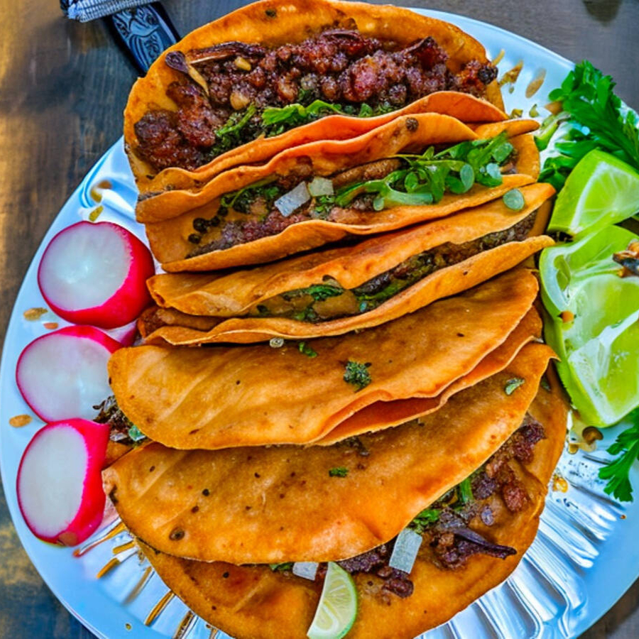 Tortilla de maiz rellena de carne de res acompañada de salsa picante y salsa verde con cebolla limón